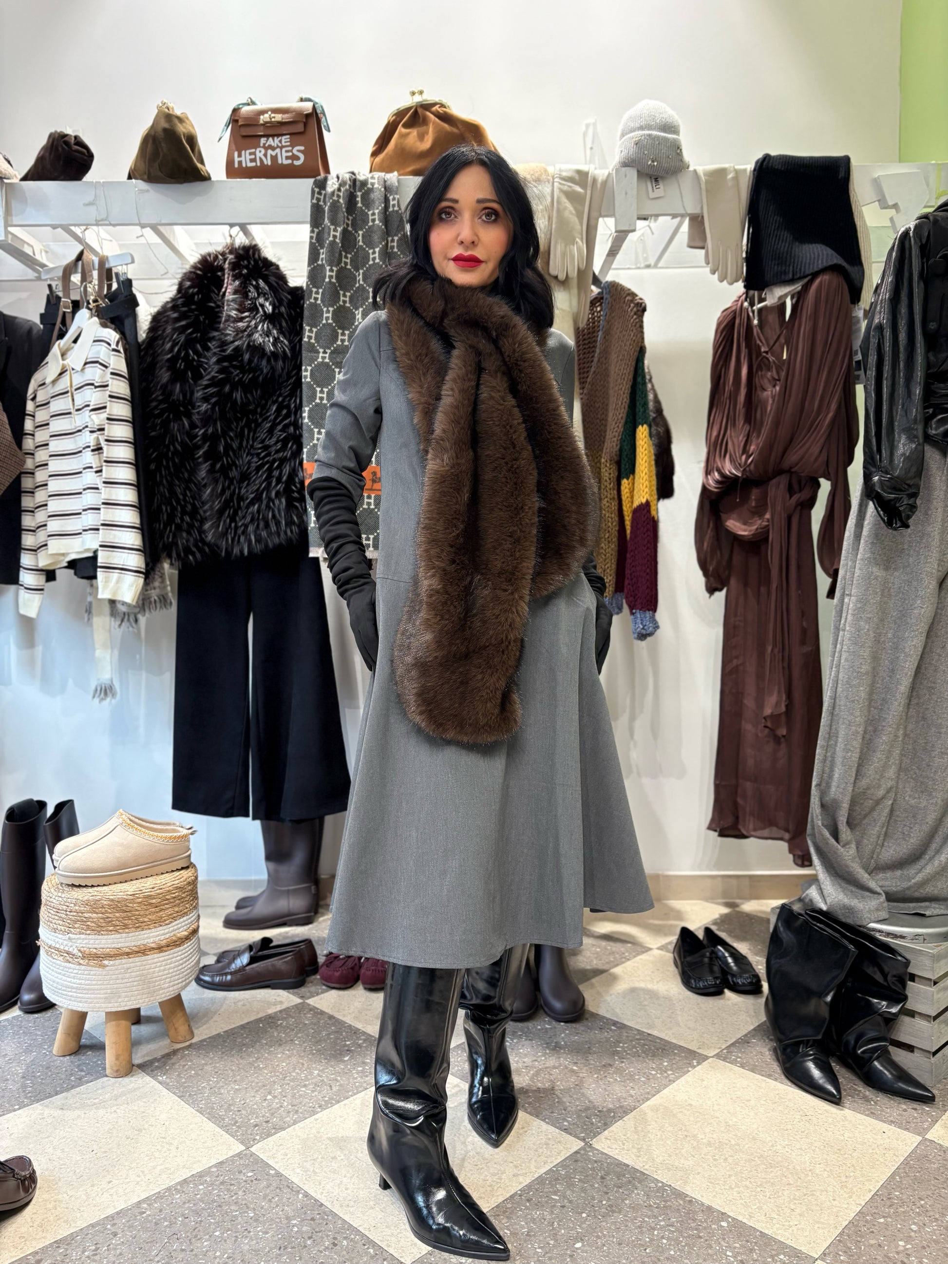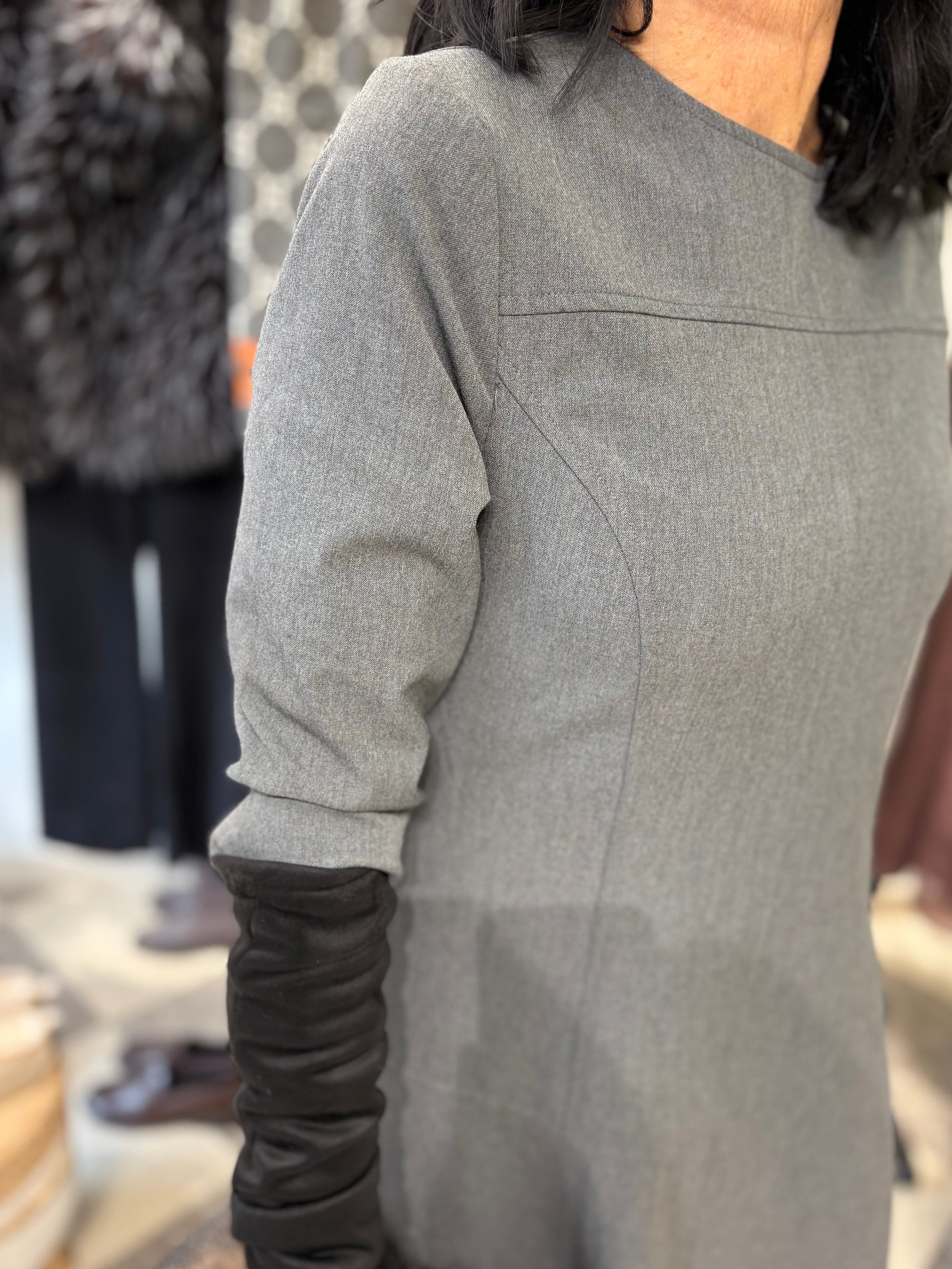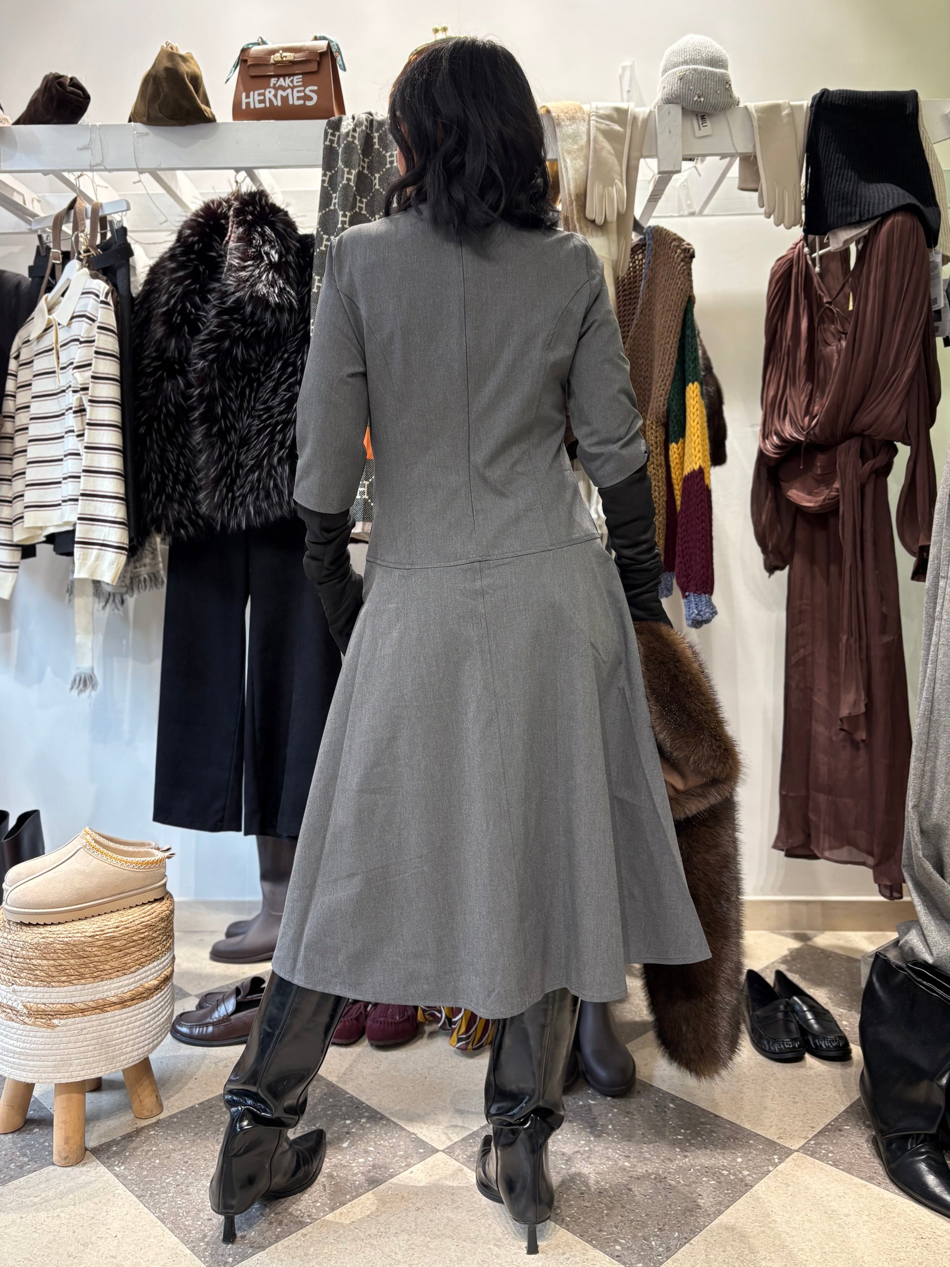 Abito grigio dalle linee pulite e minimali, lunghezza midi, con le tasche.