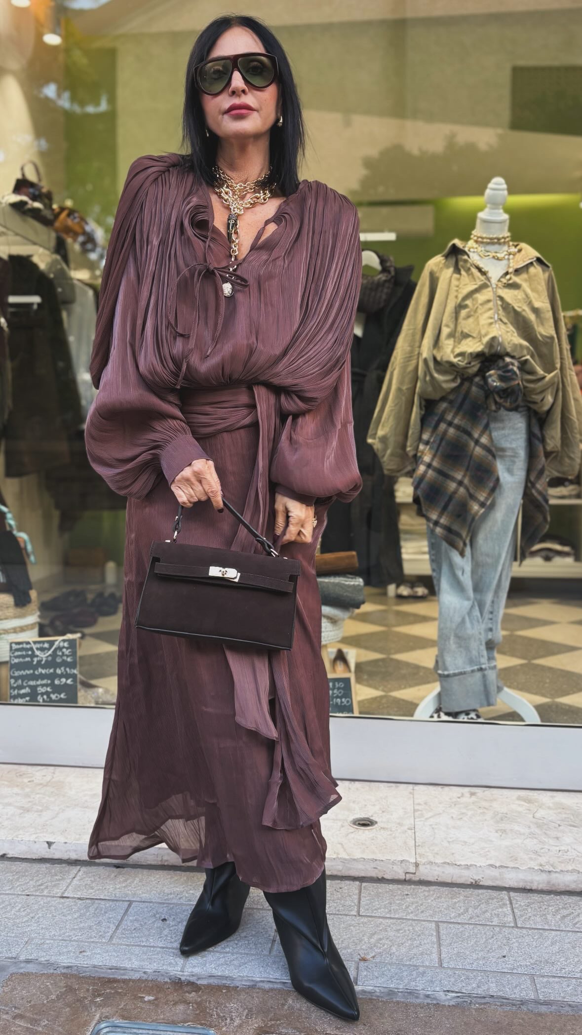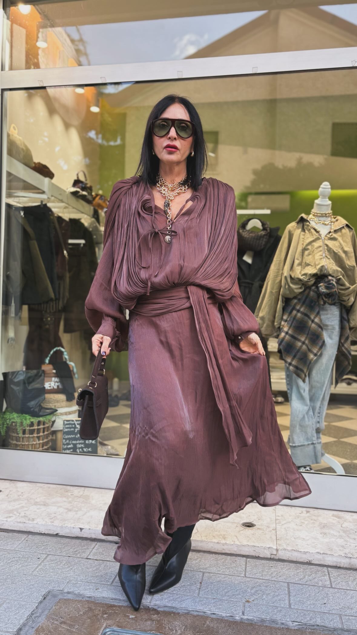 Abito midi, con spalline imbottite, allacciatura sul davanti.