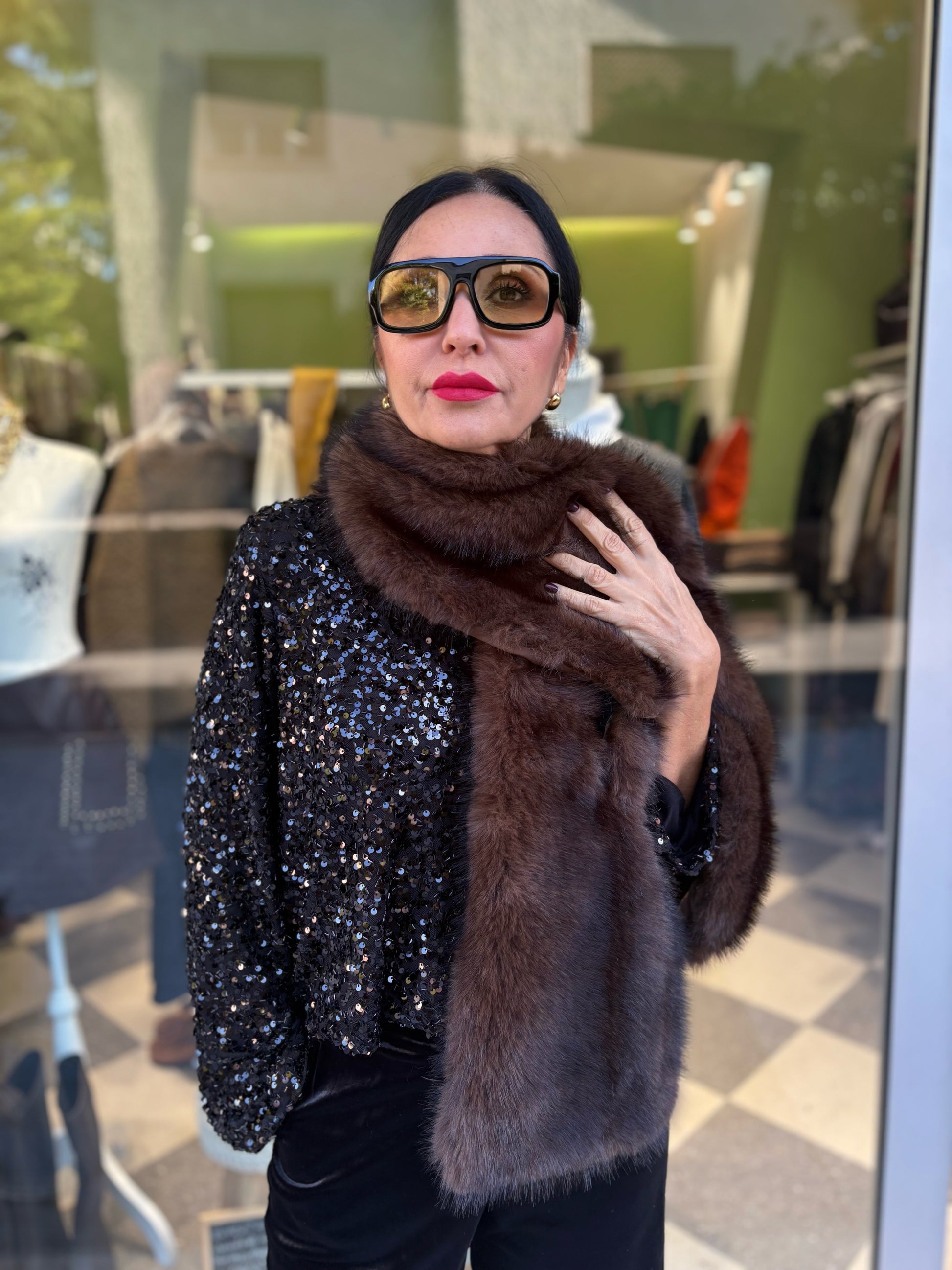 Blusa con paillettes nere e chiusura con fiocco sul retro.