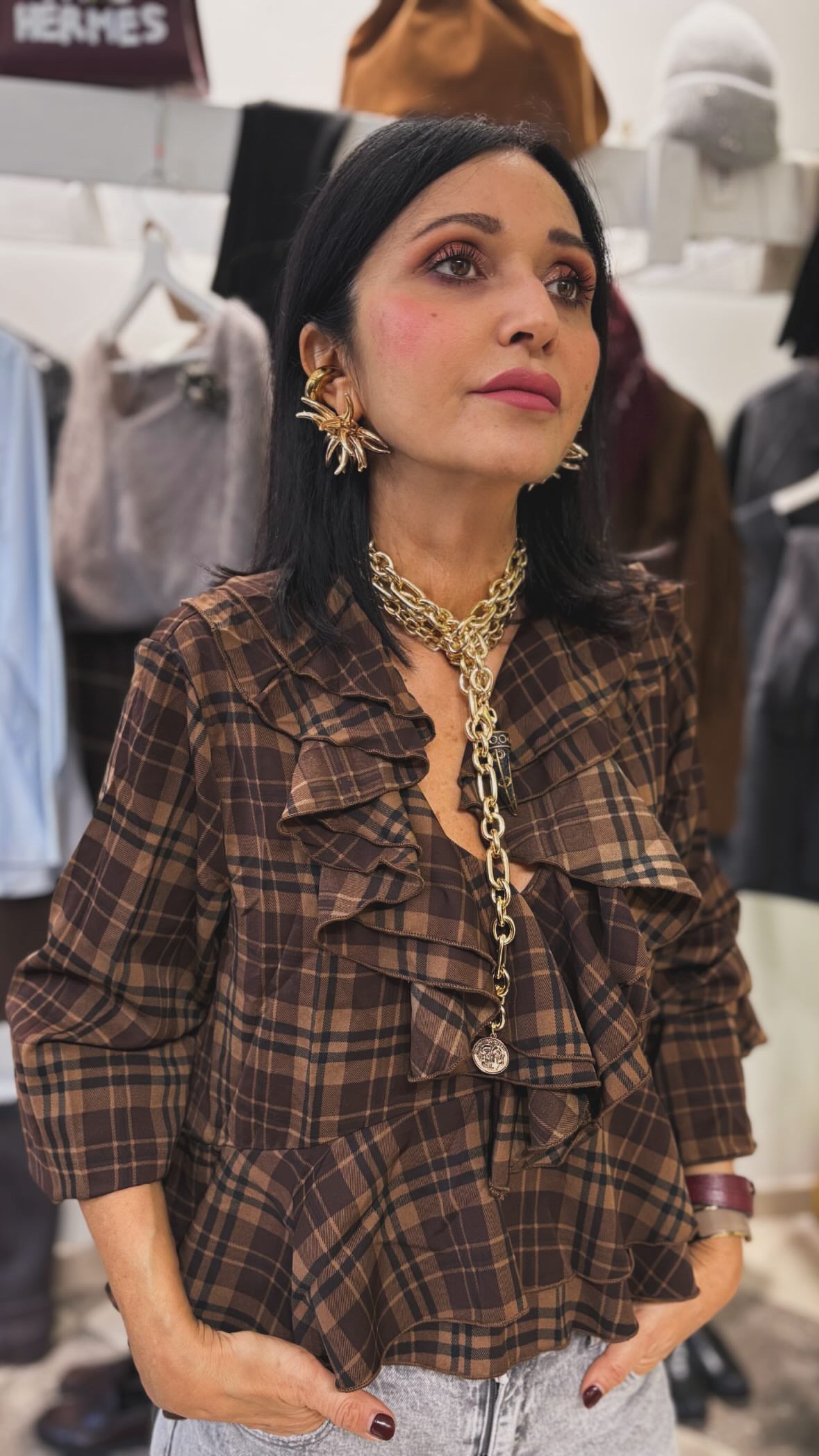 Blusa fantasia check sui toni del cioccolato e del beige.