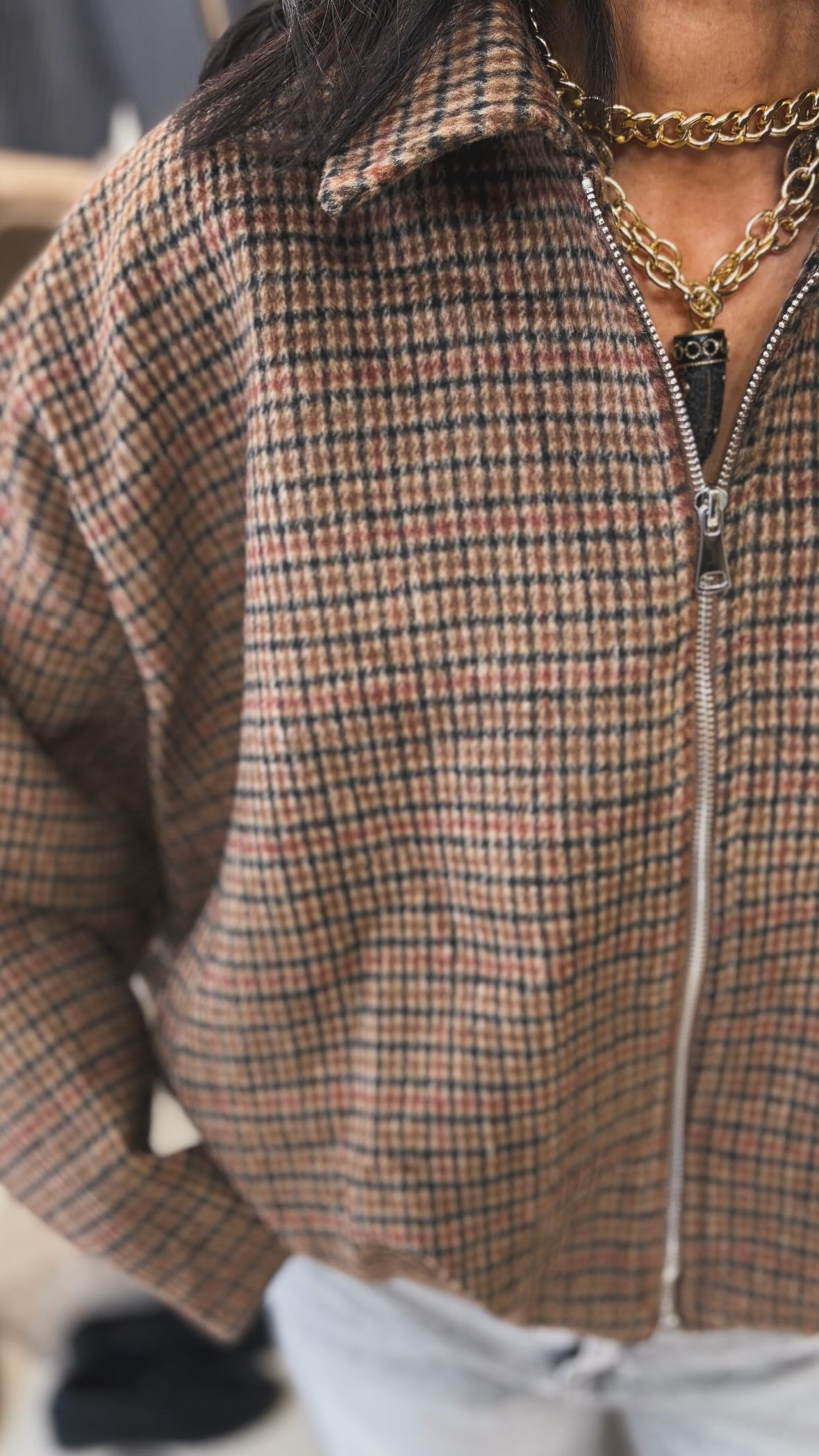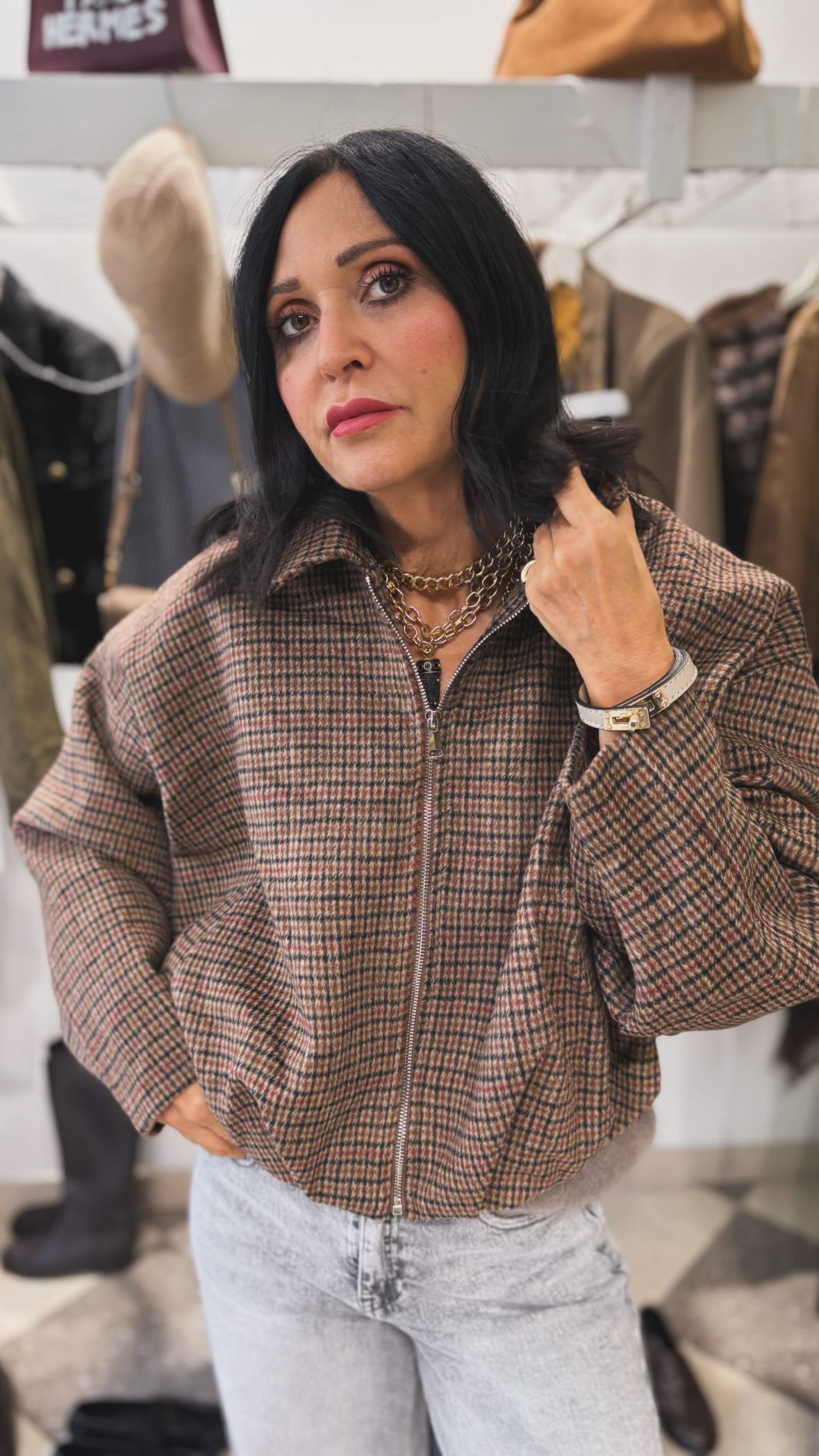 Bomber con zip. Fantasia micro check sui toni del cioccolato, beige e bruciato.