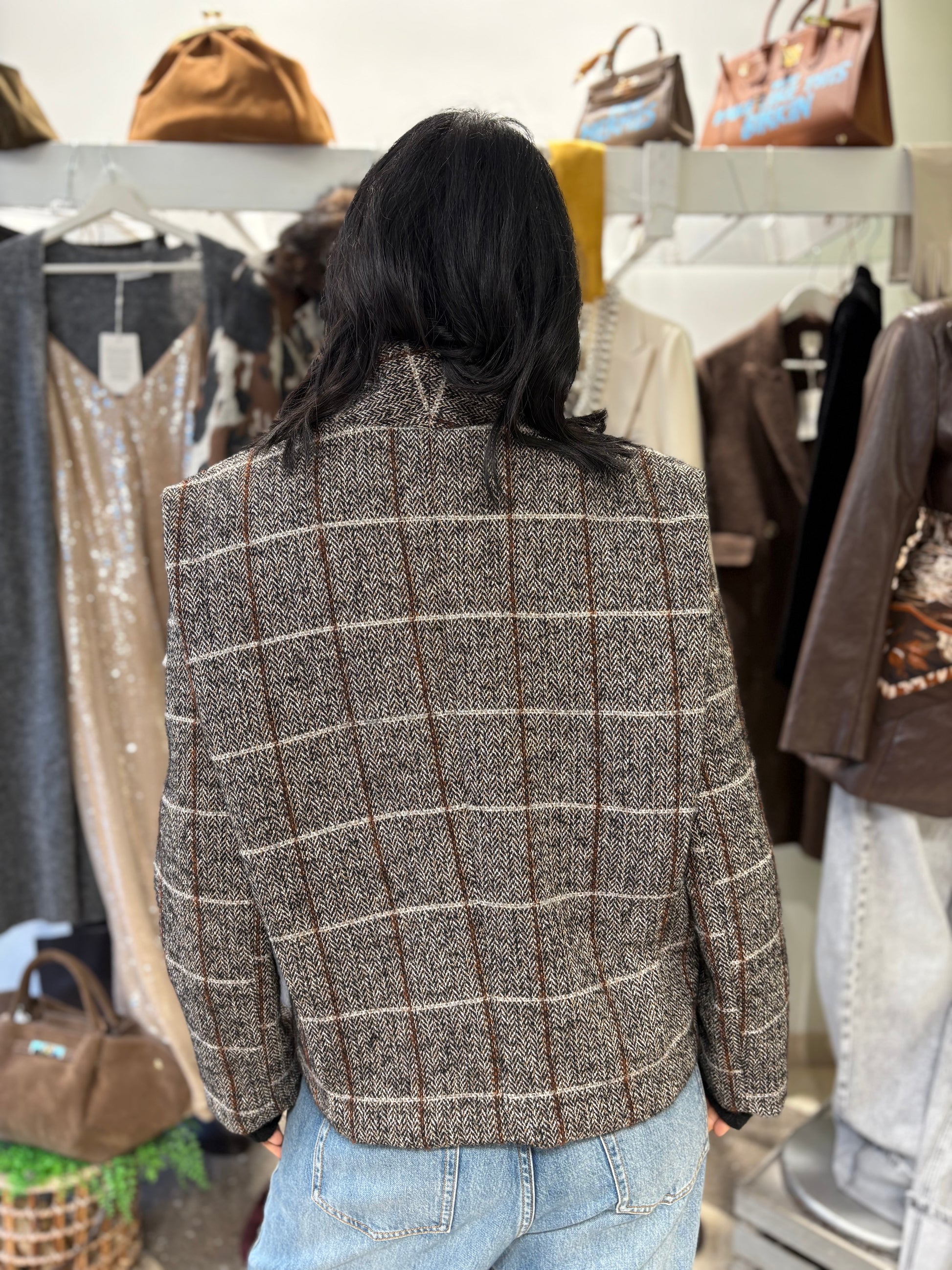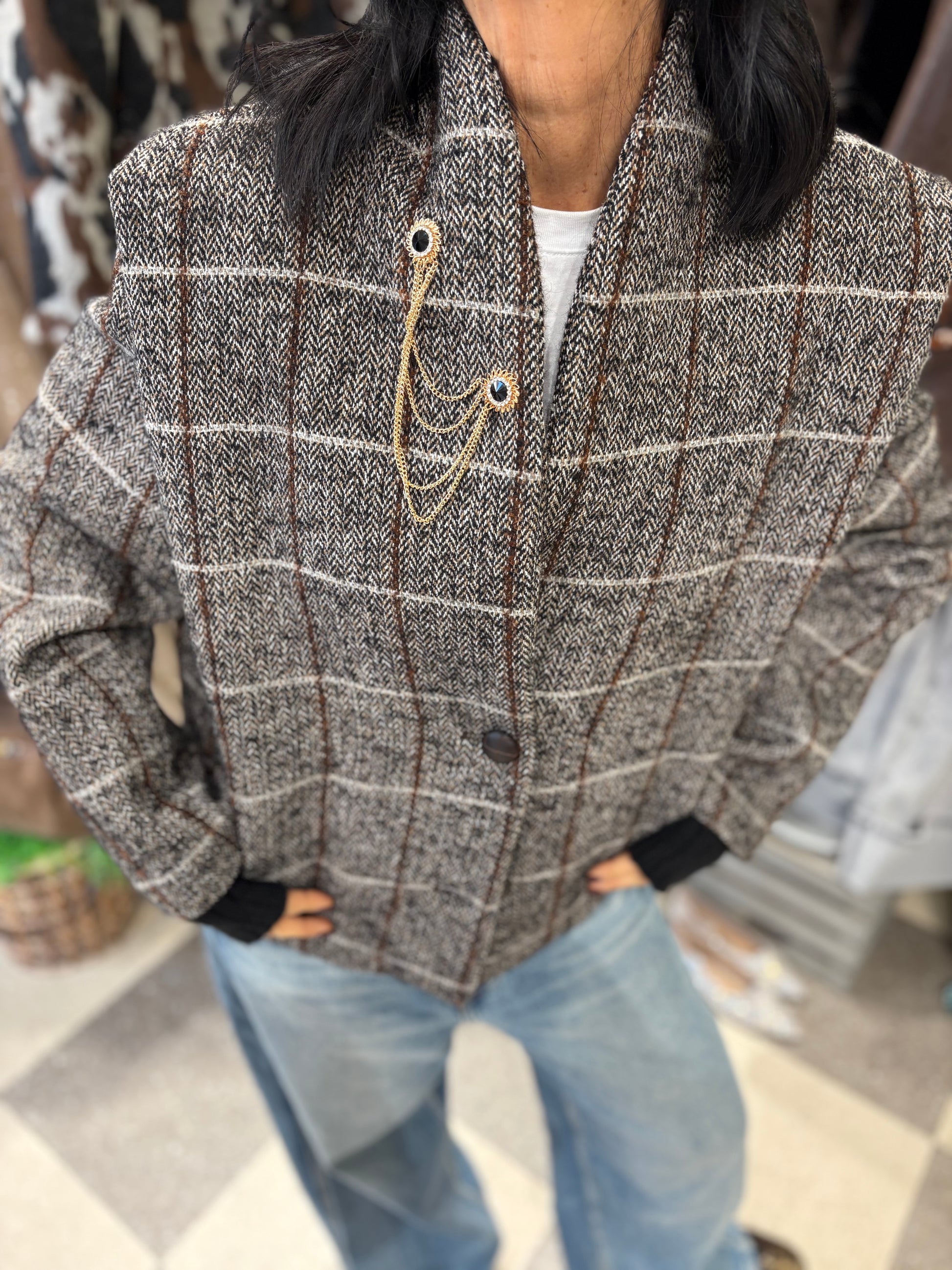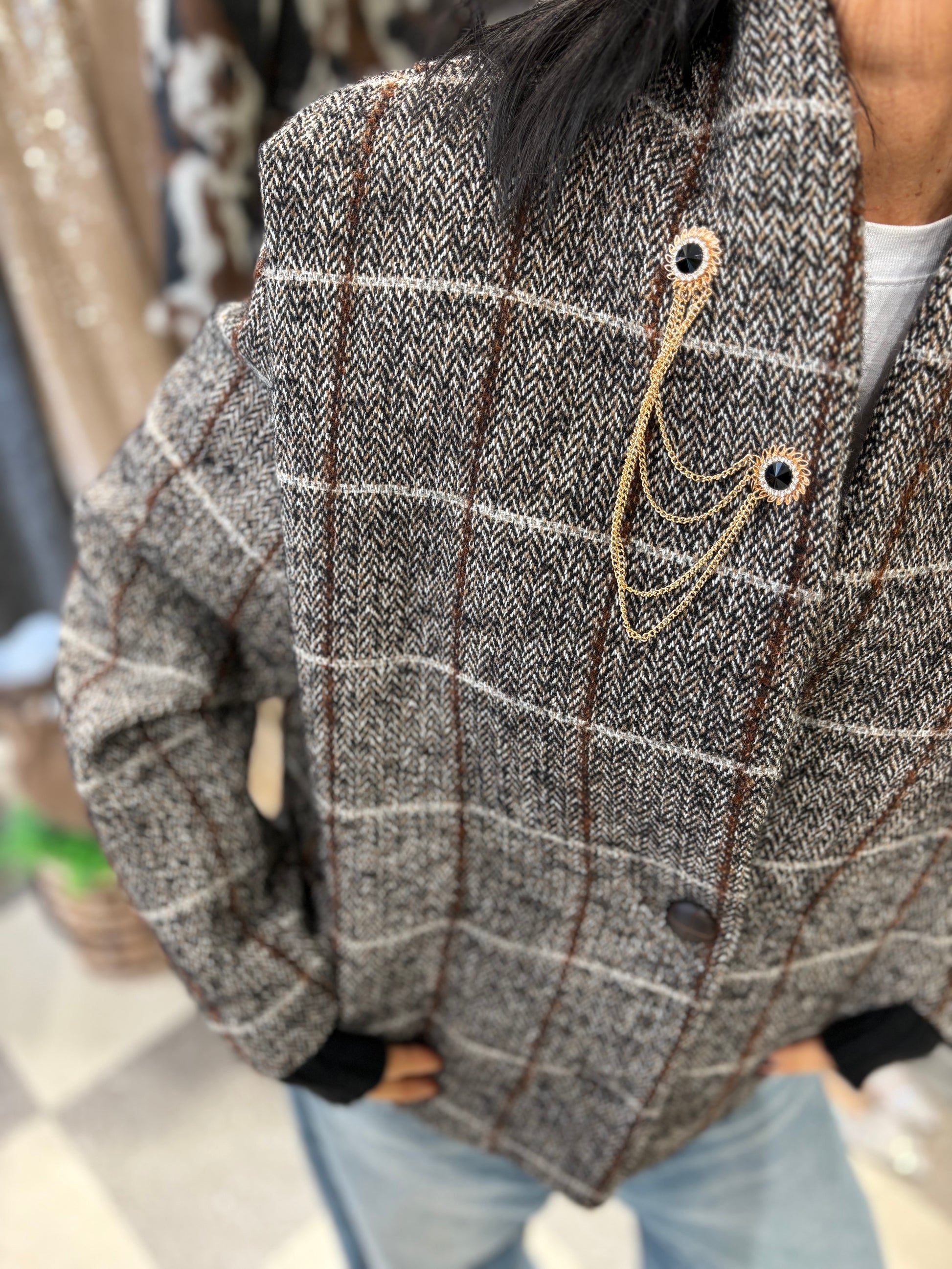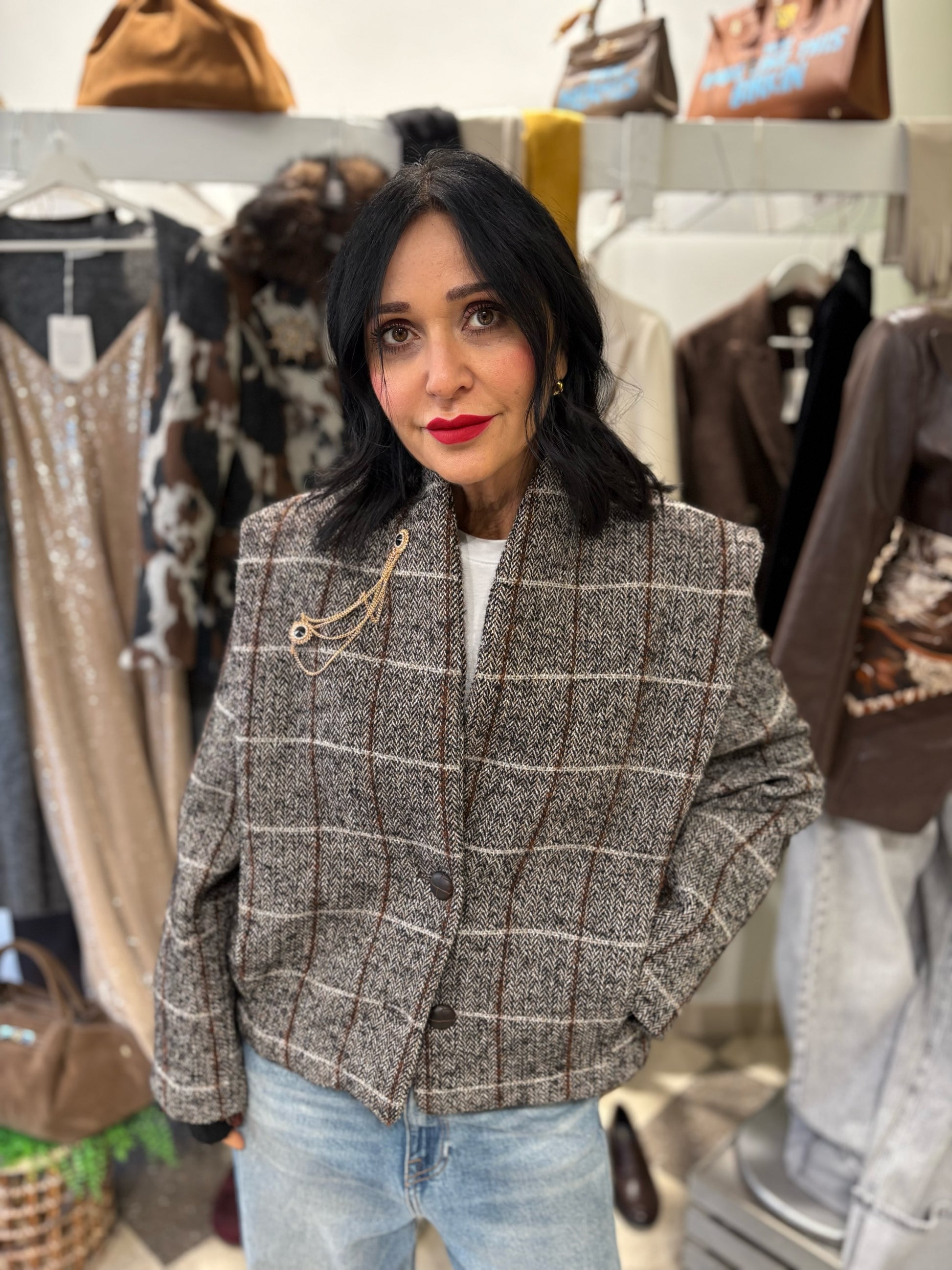 Capospalla sartoriale corto caratterizzato da una struttura decisa e da una raffinata fantasia a quadri. Il taglio pulito e la linea compatta lo rendono un capo versatile, perfetto come alternativa al cappotto nelle mezze stagioni. Da indossare sopra look casual o più costruiti per un’eleganza contemporanea e senza tempo.