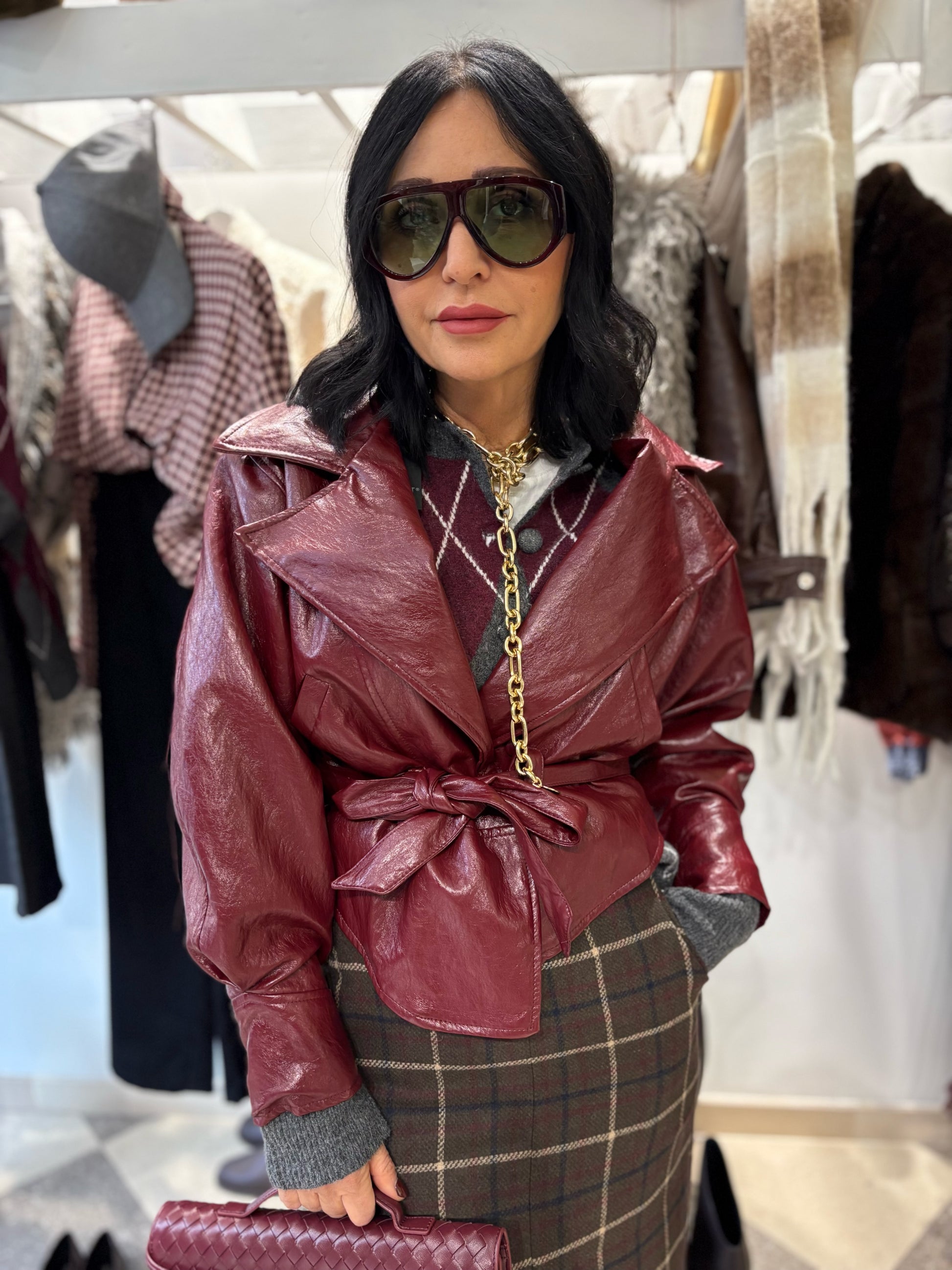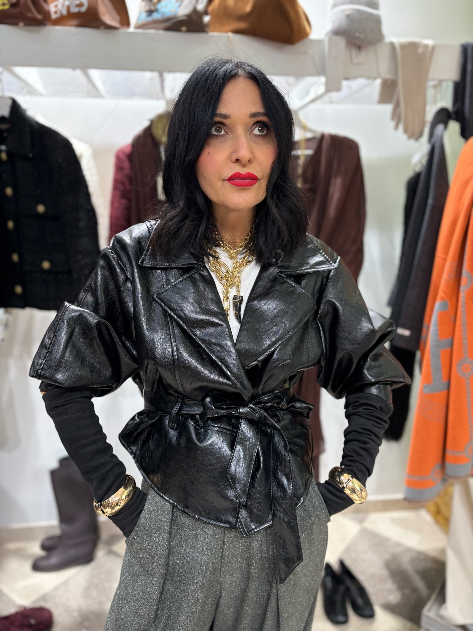 Chiodo in ecopelle con cintura in vita.