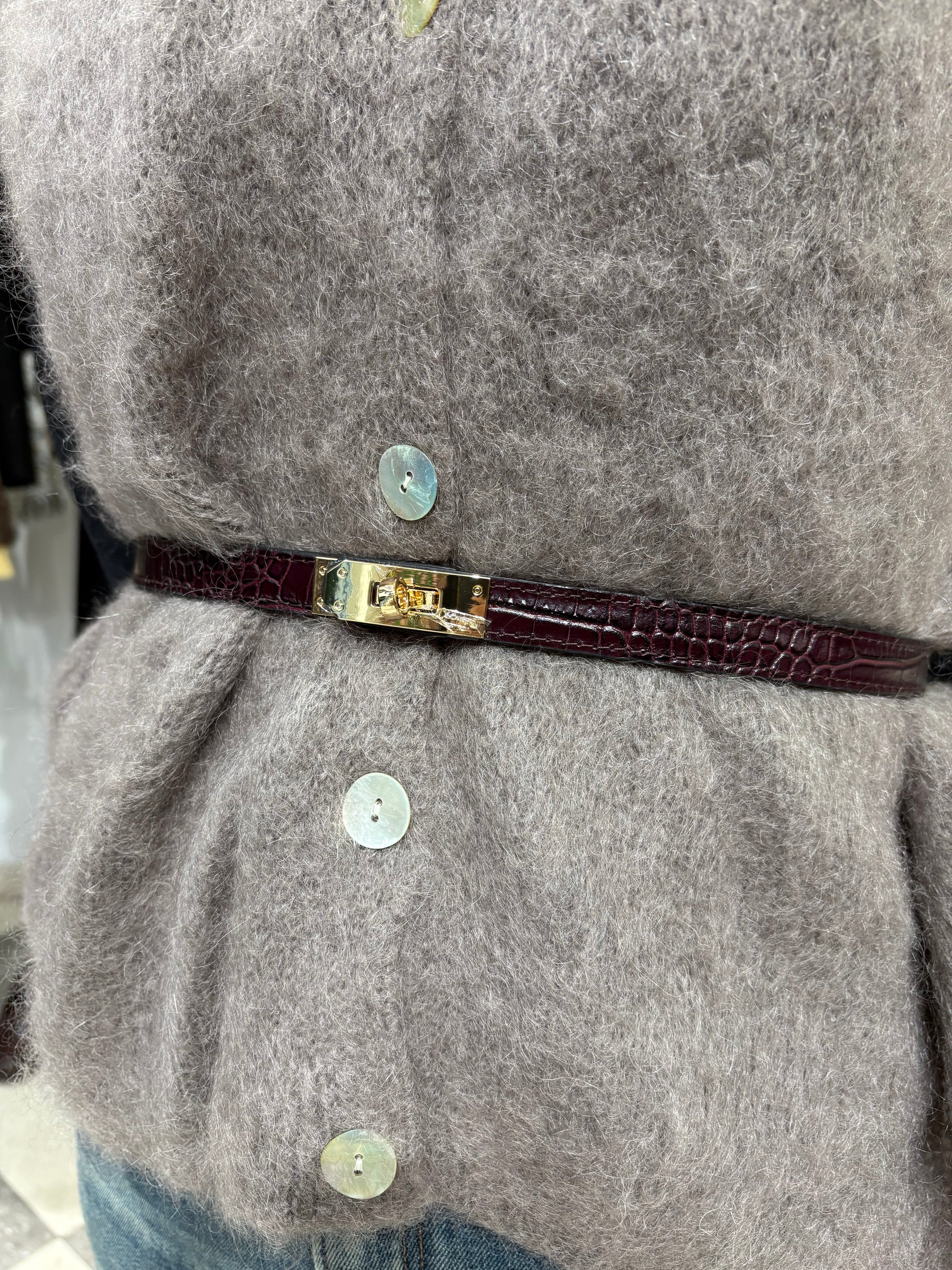 Cintura in vera pelle stampa cocco, color vino scuro. Regolabile con cursore sul retro, hardware oro.