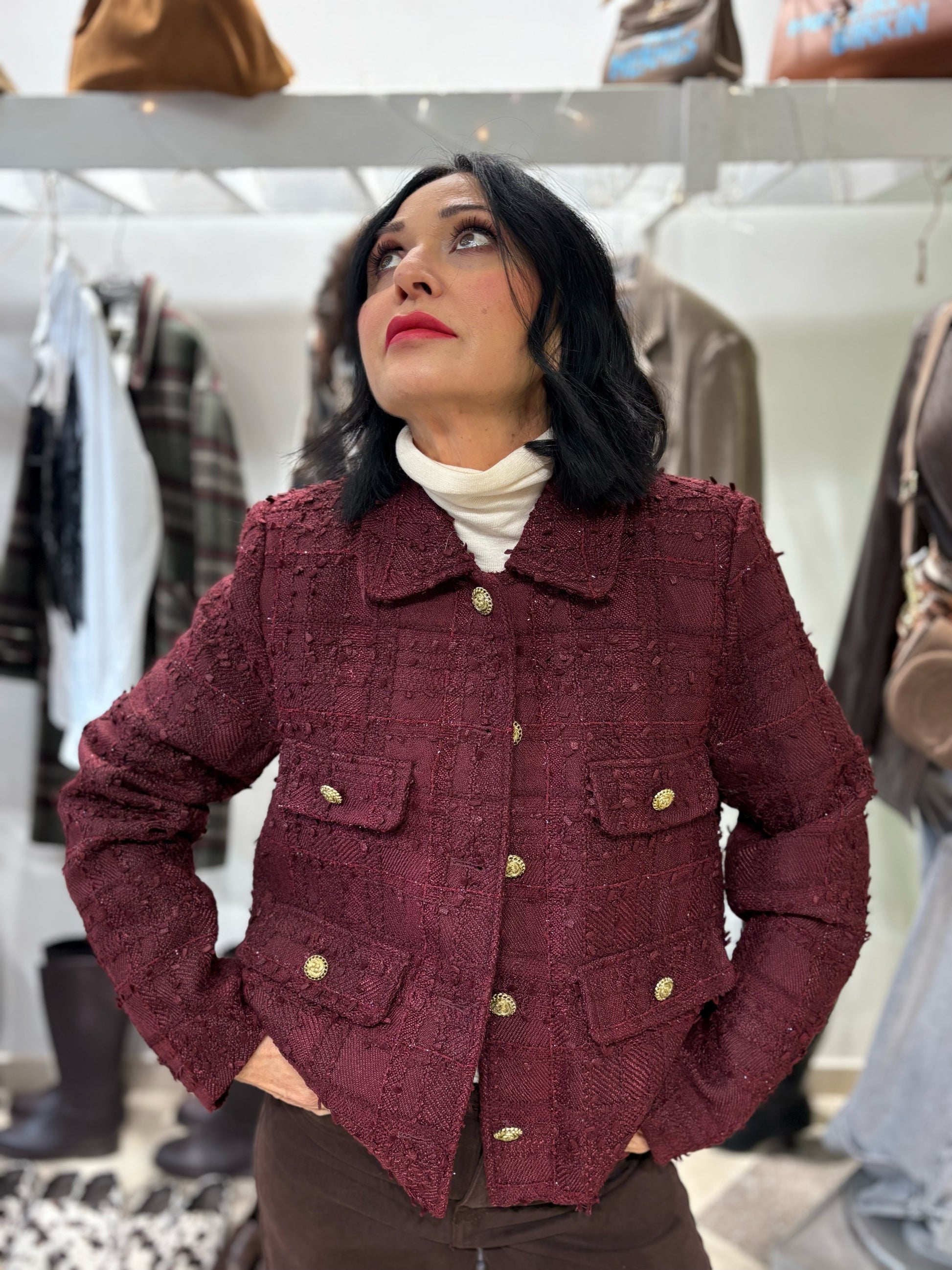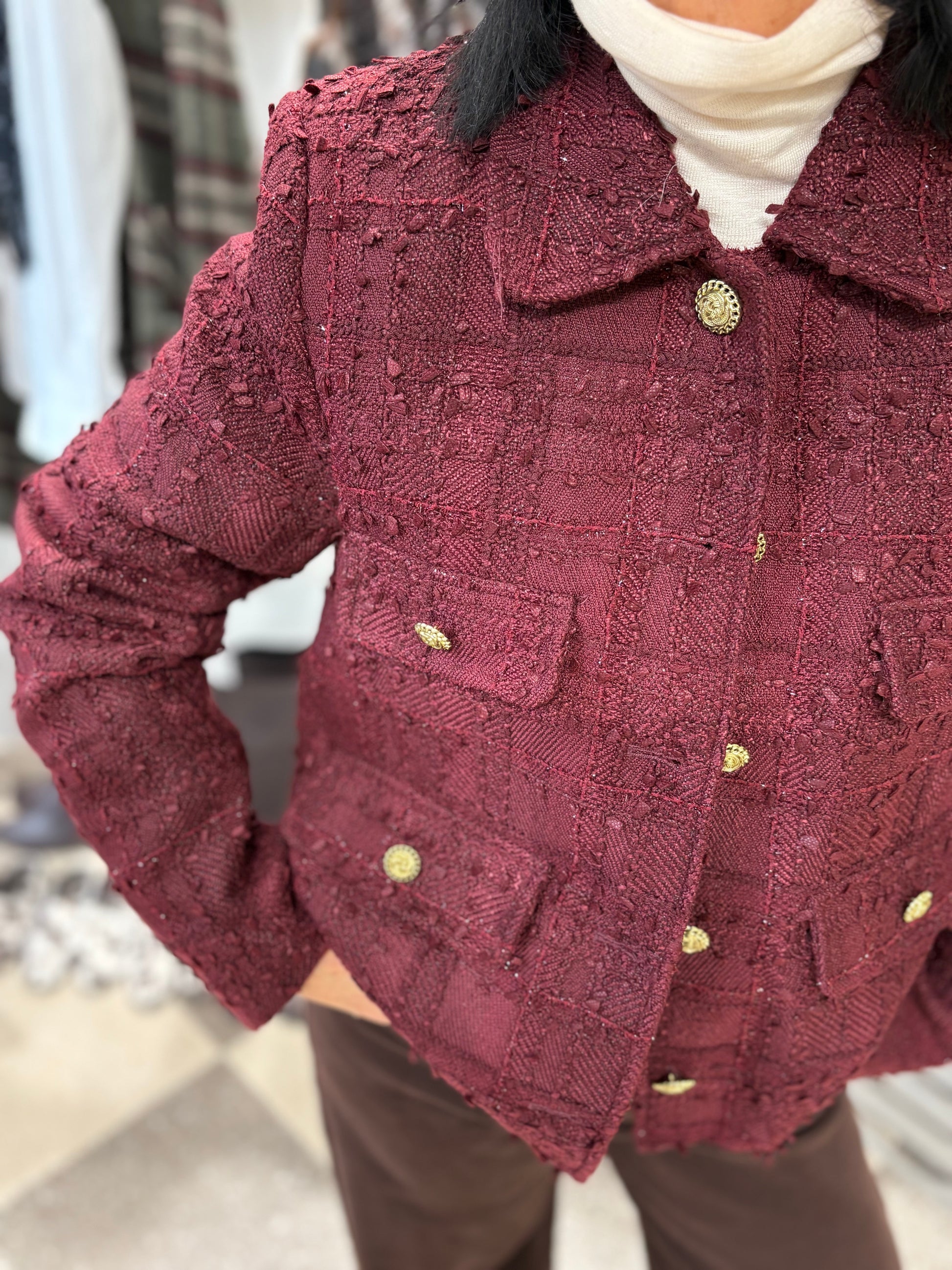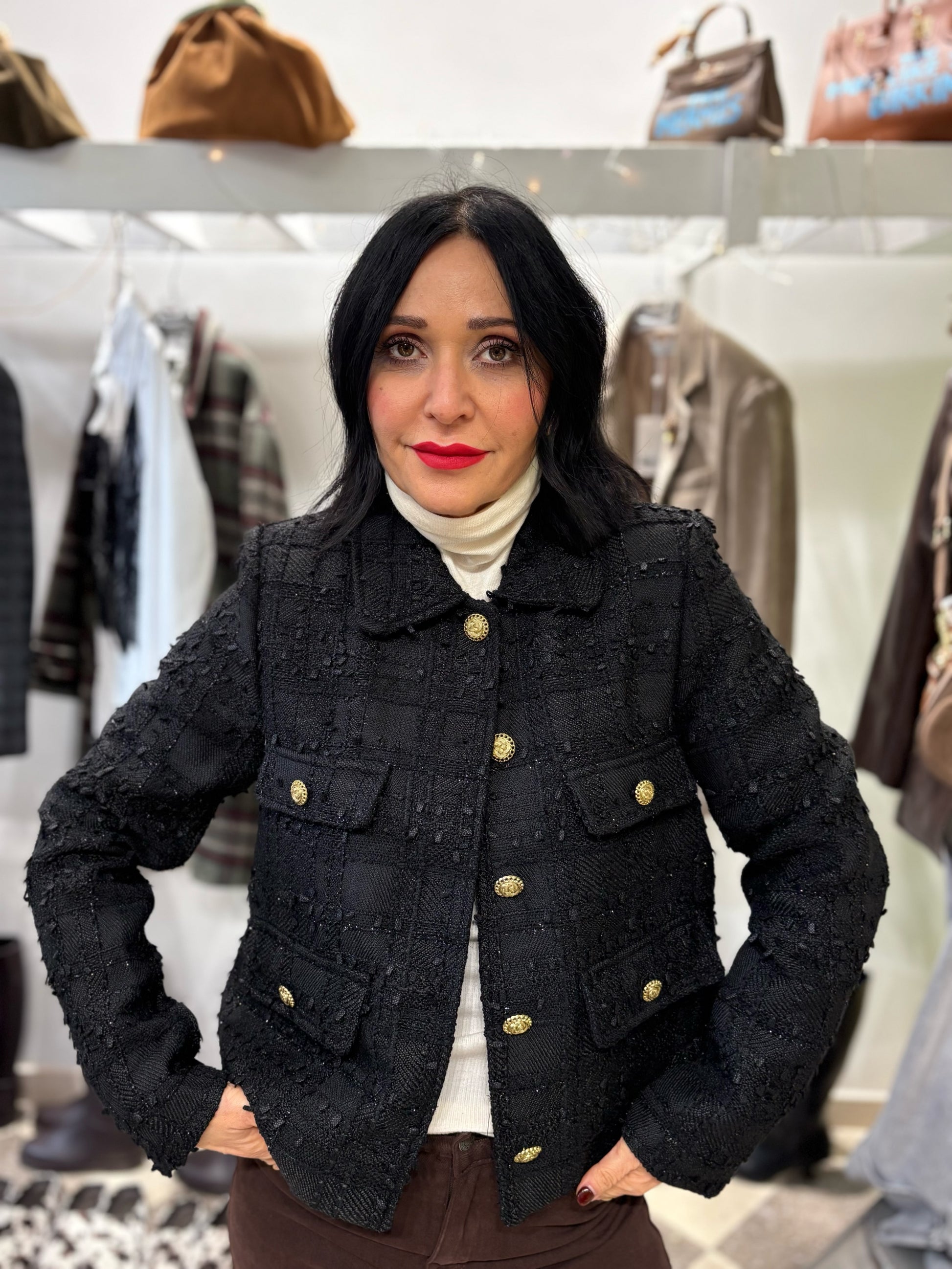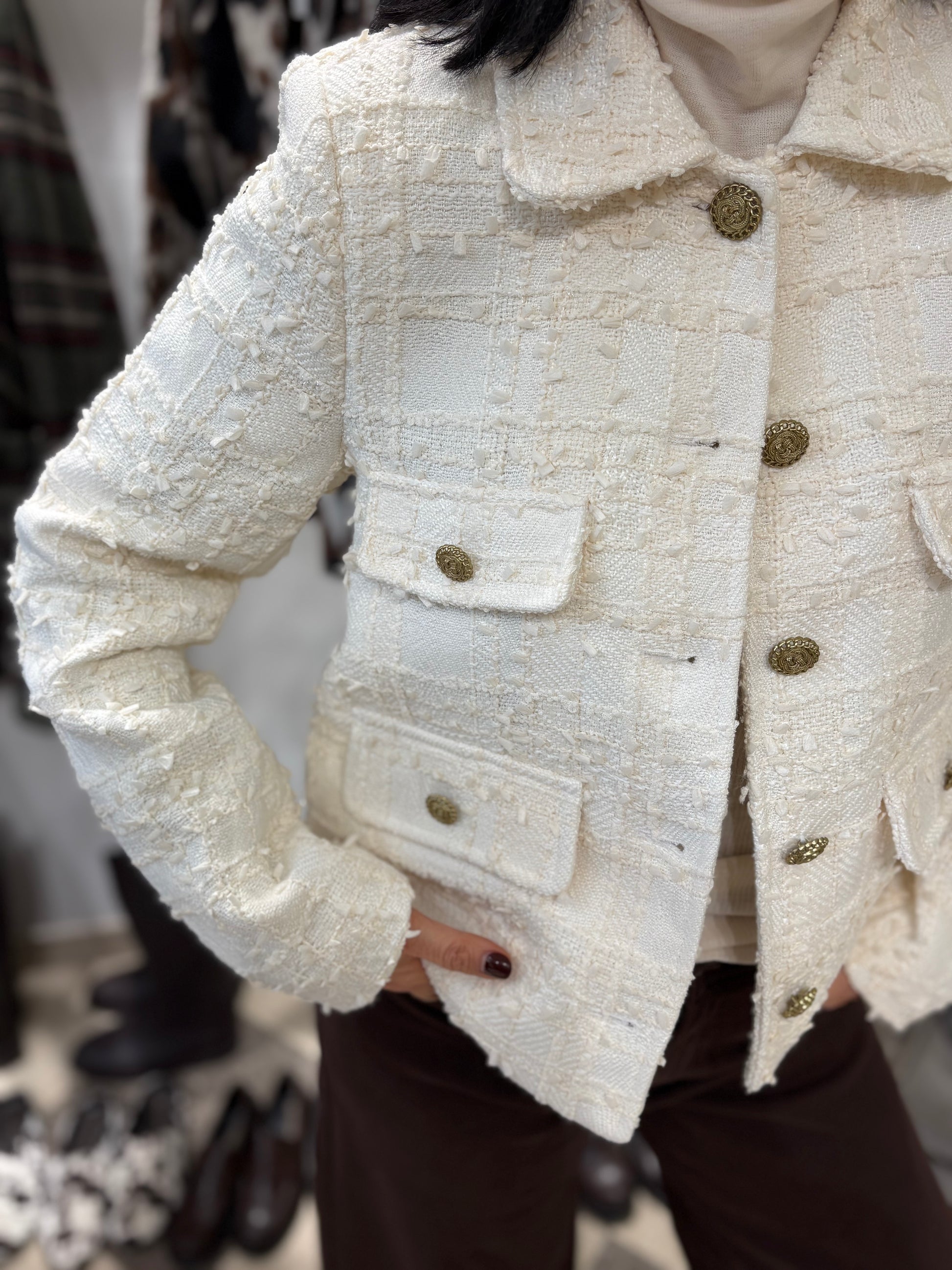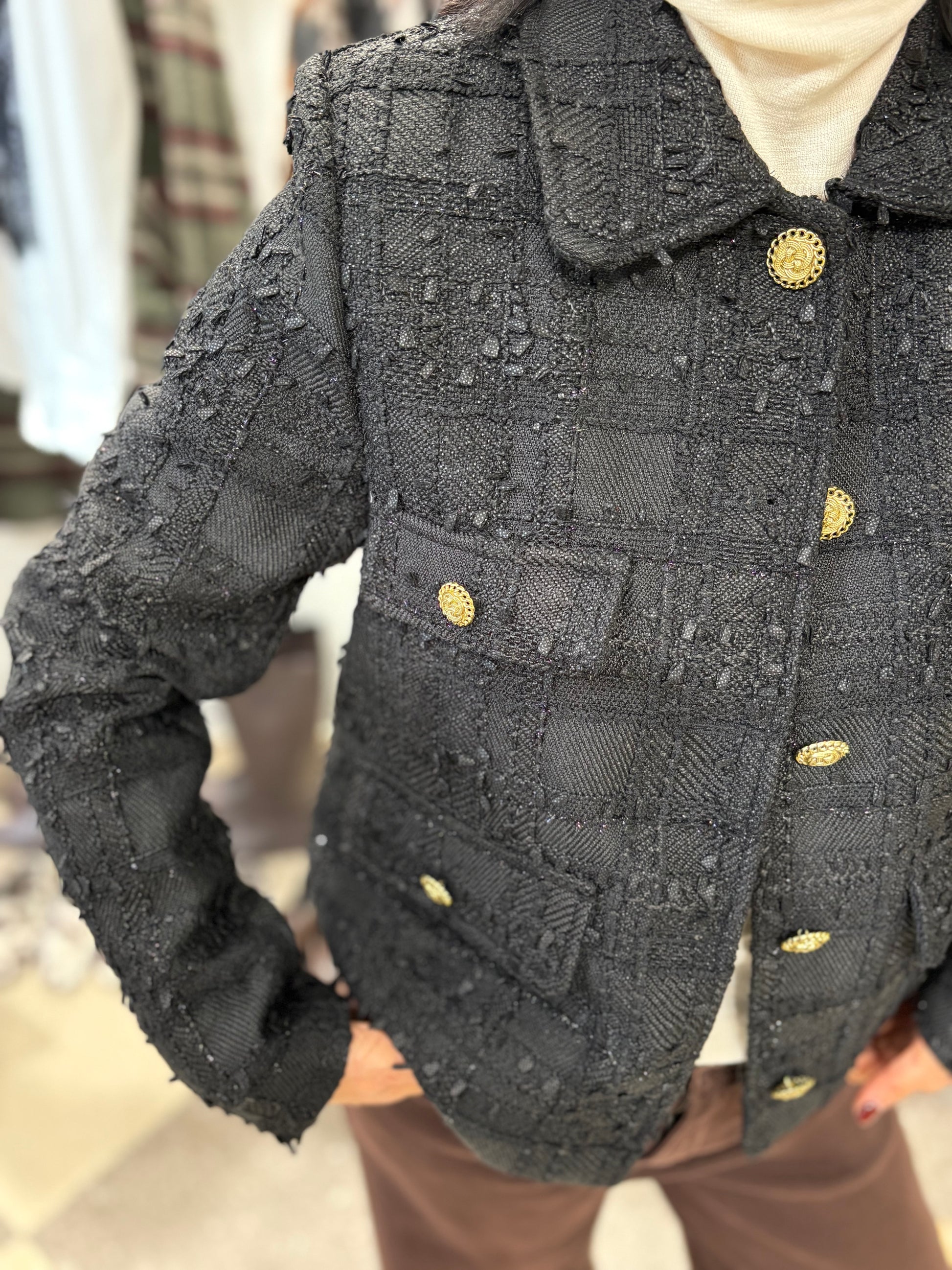 Giacca tweed con bottoni gioiello.