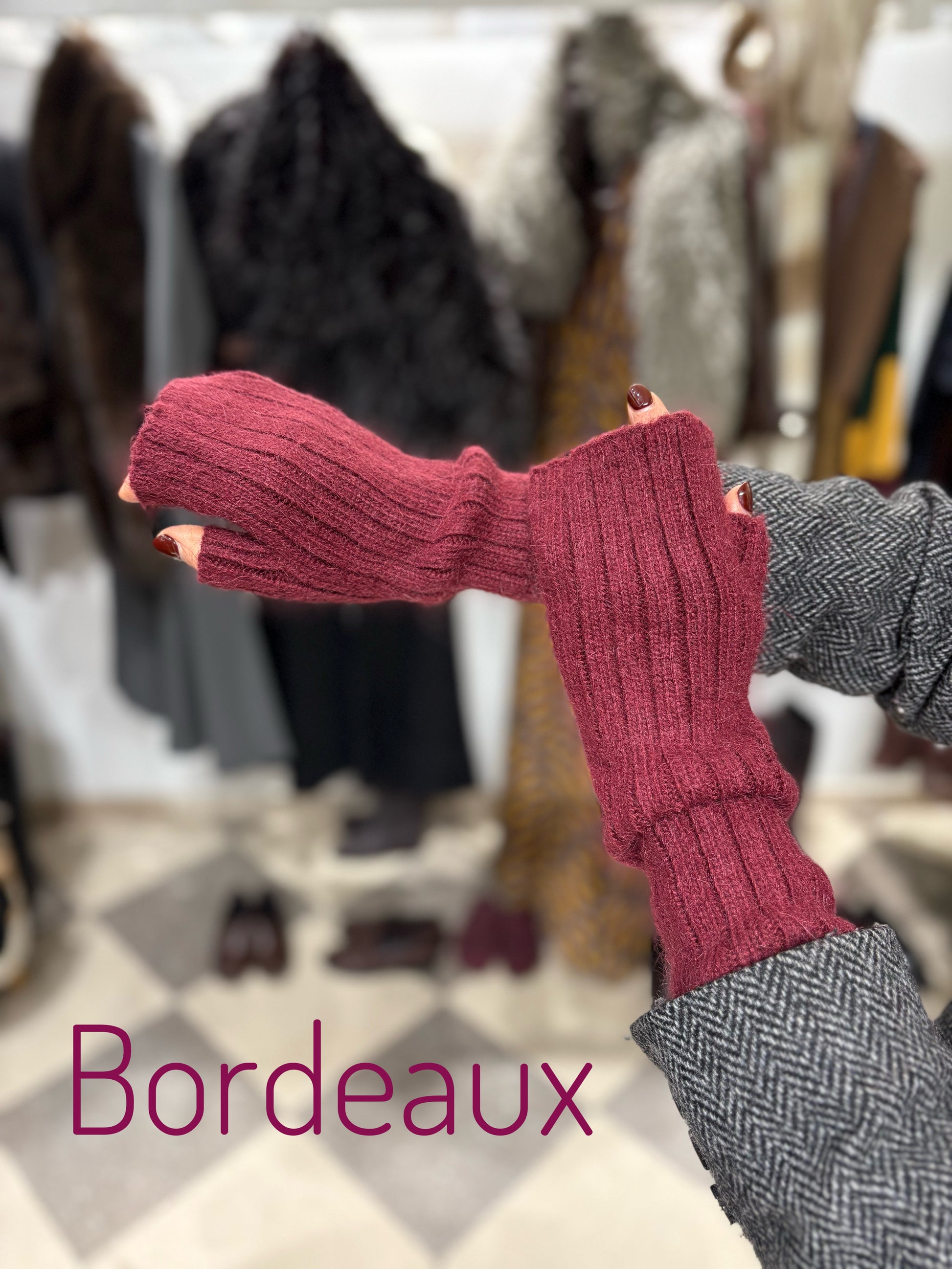 Manicotti in lana e viscosa, disponibili in diverse varianti colore.