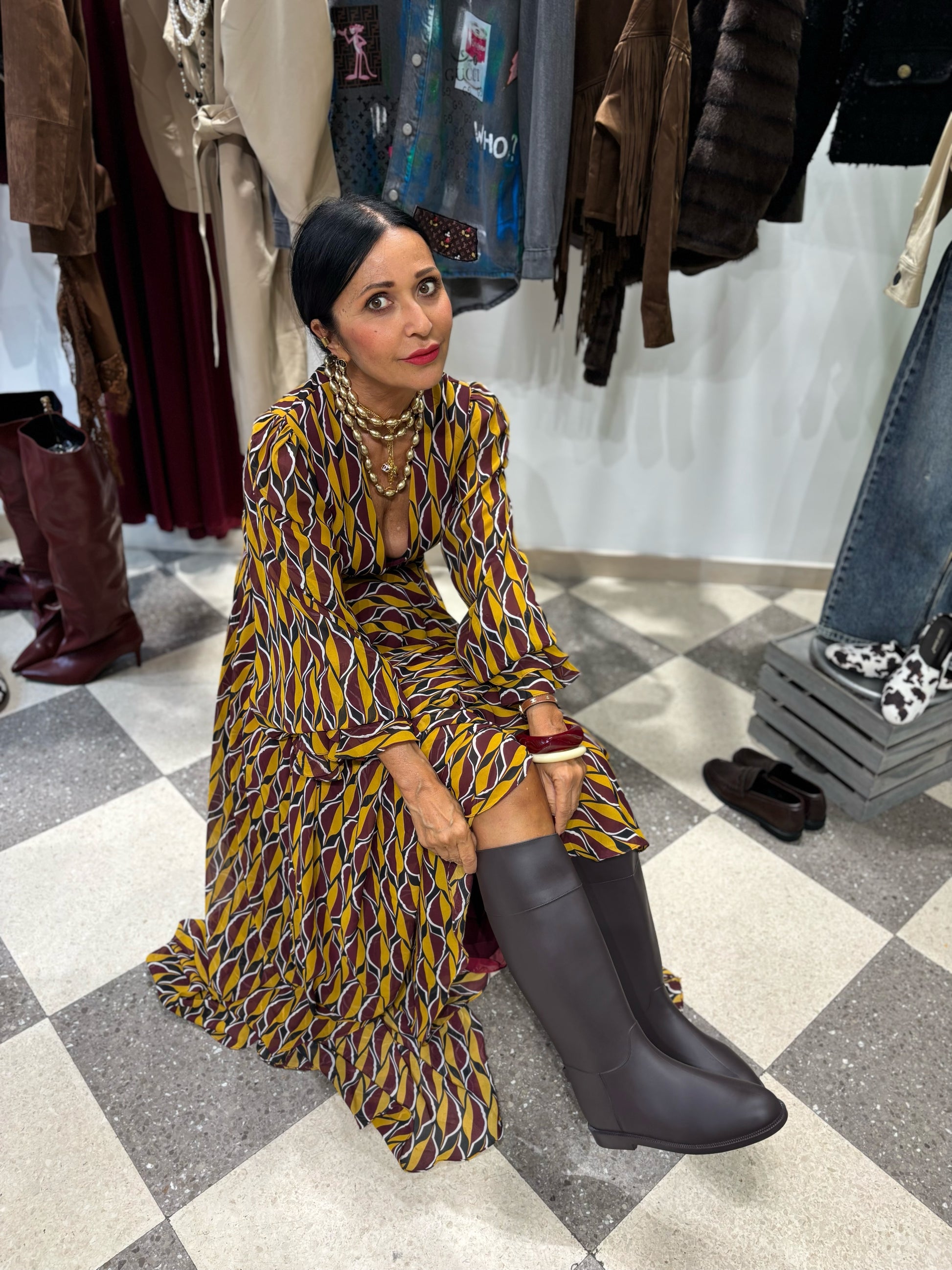 Maxi abito fantasia geometrica senape e bordeaux.