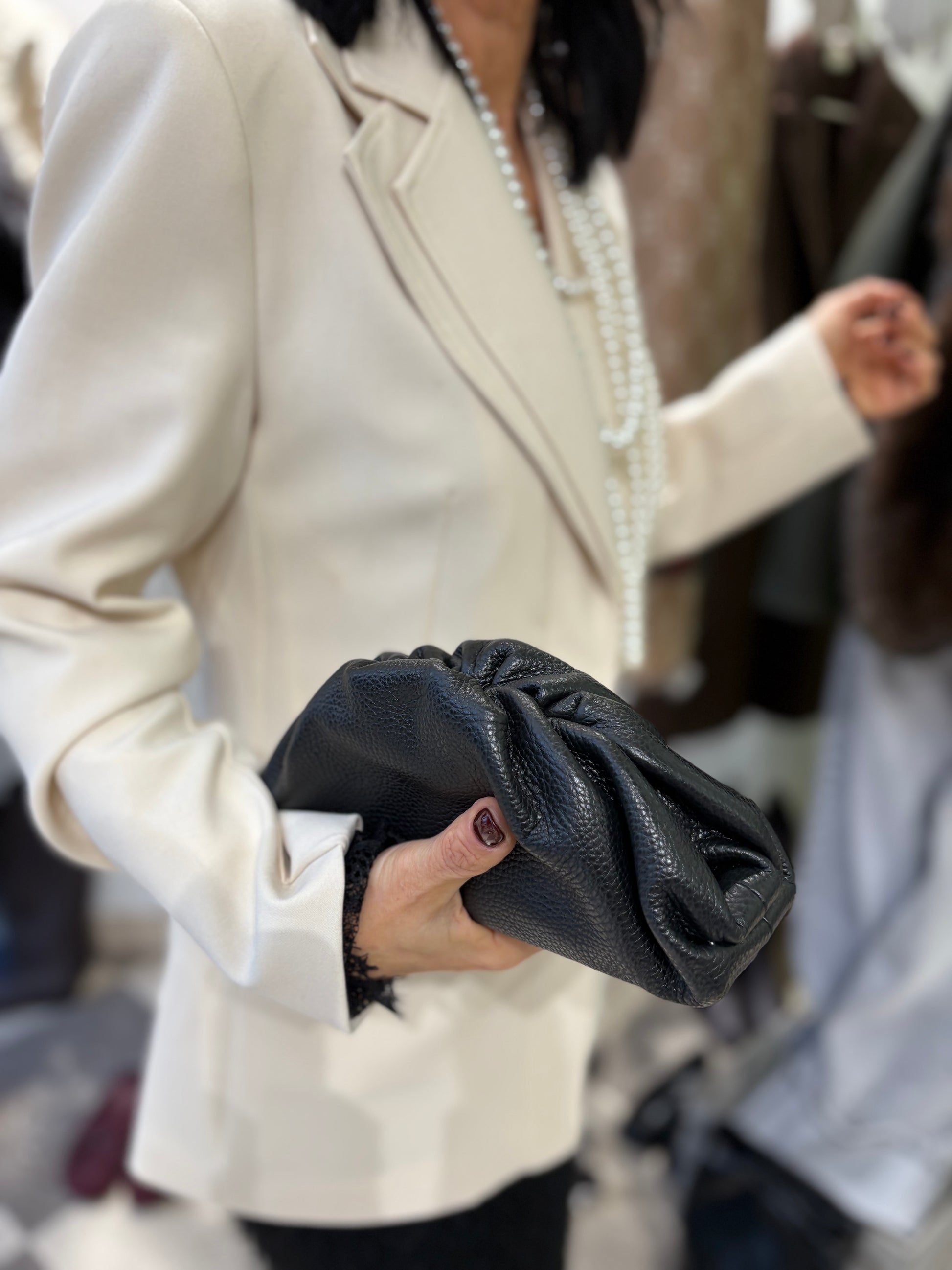 Mini pouch in vera pelle. Color nero. Dotata di tracolla a catena.