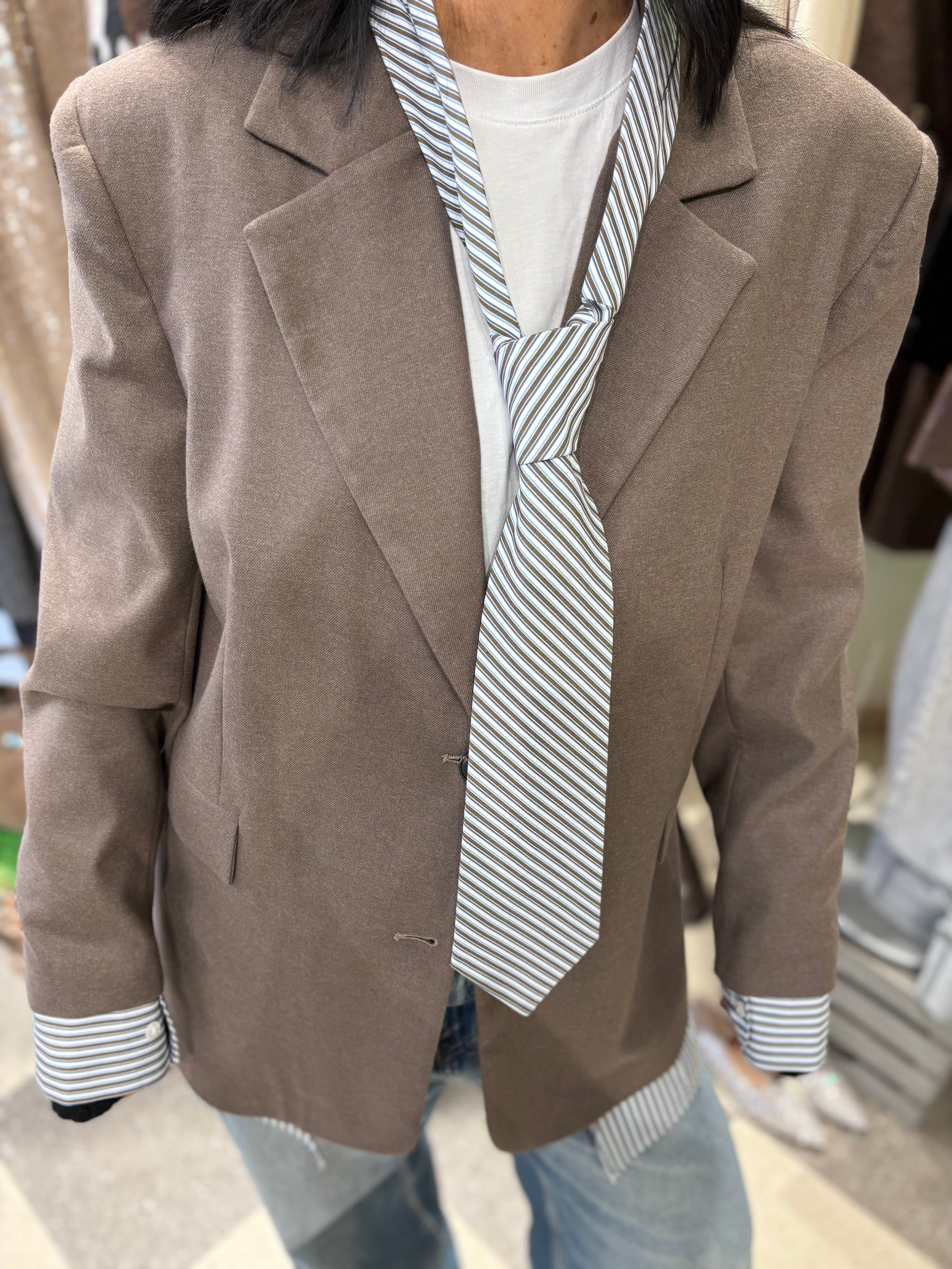 Giacca dal taglio sartoriale con dettagli a contrasto: polsini e fondo rifiniti con inserto rigato effetto camicia, per un raffinato gioco di sovrapposizioni. Un capo strutturato ma versatile, che unisce rigore e stile contemporaneo. Cravatta compresa.