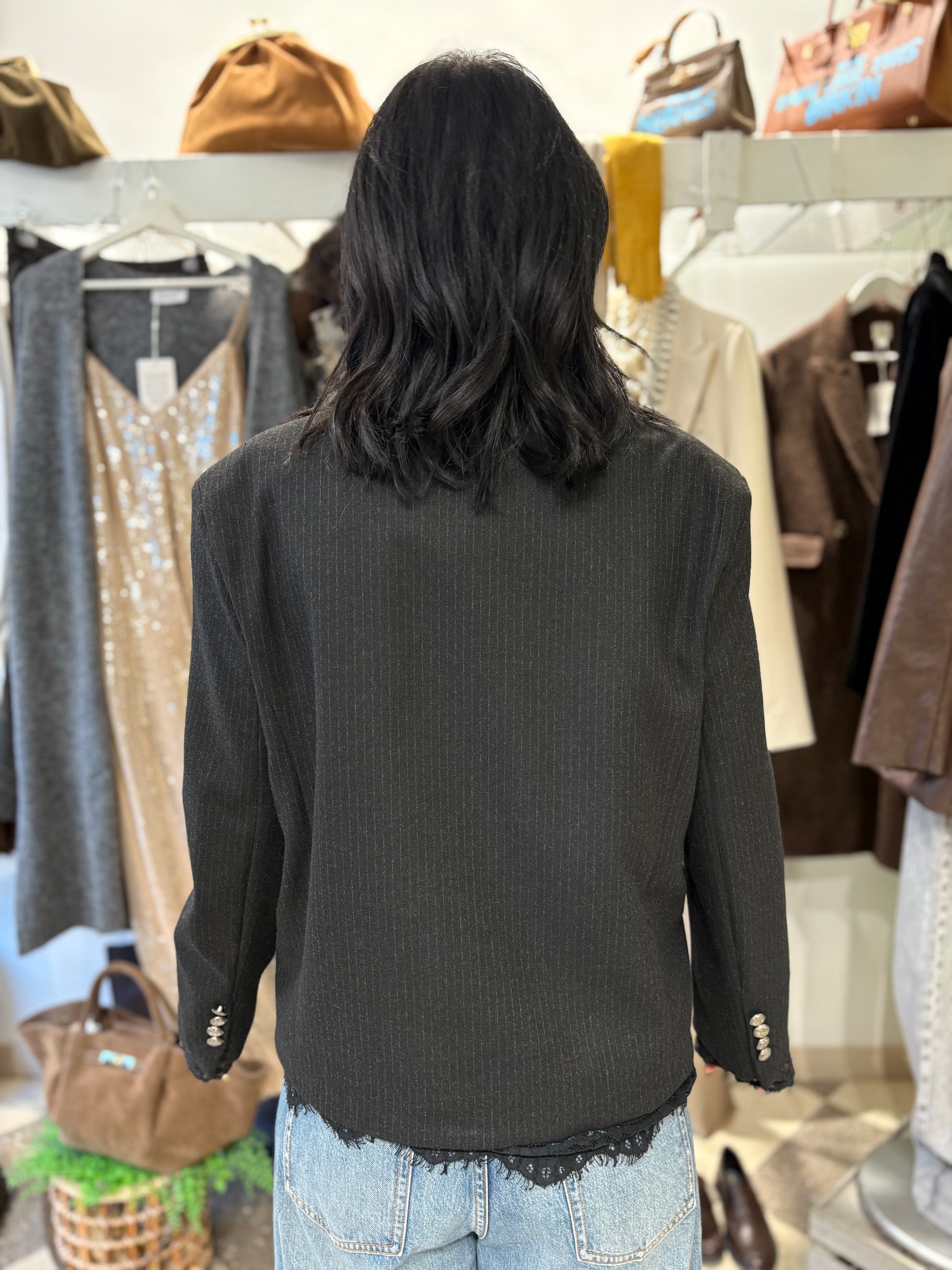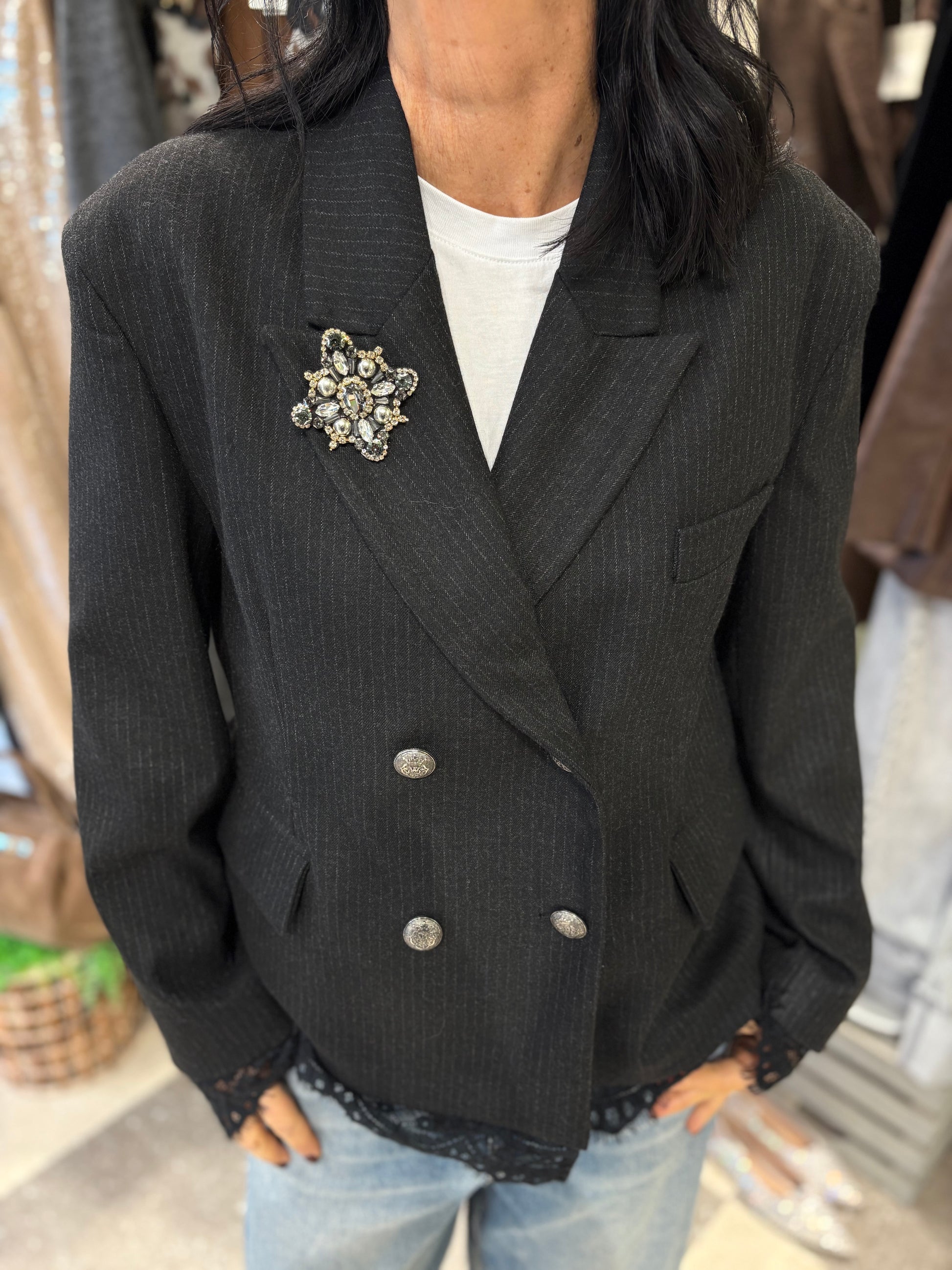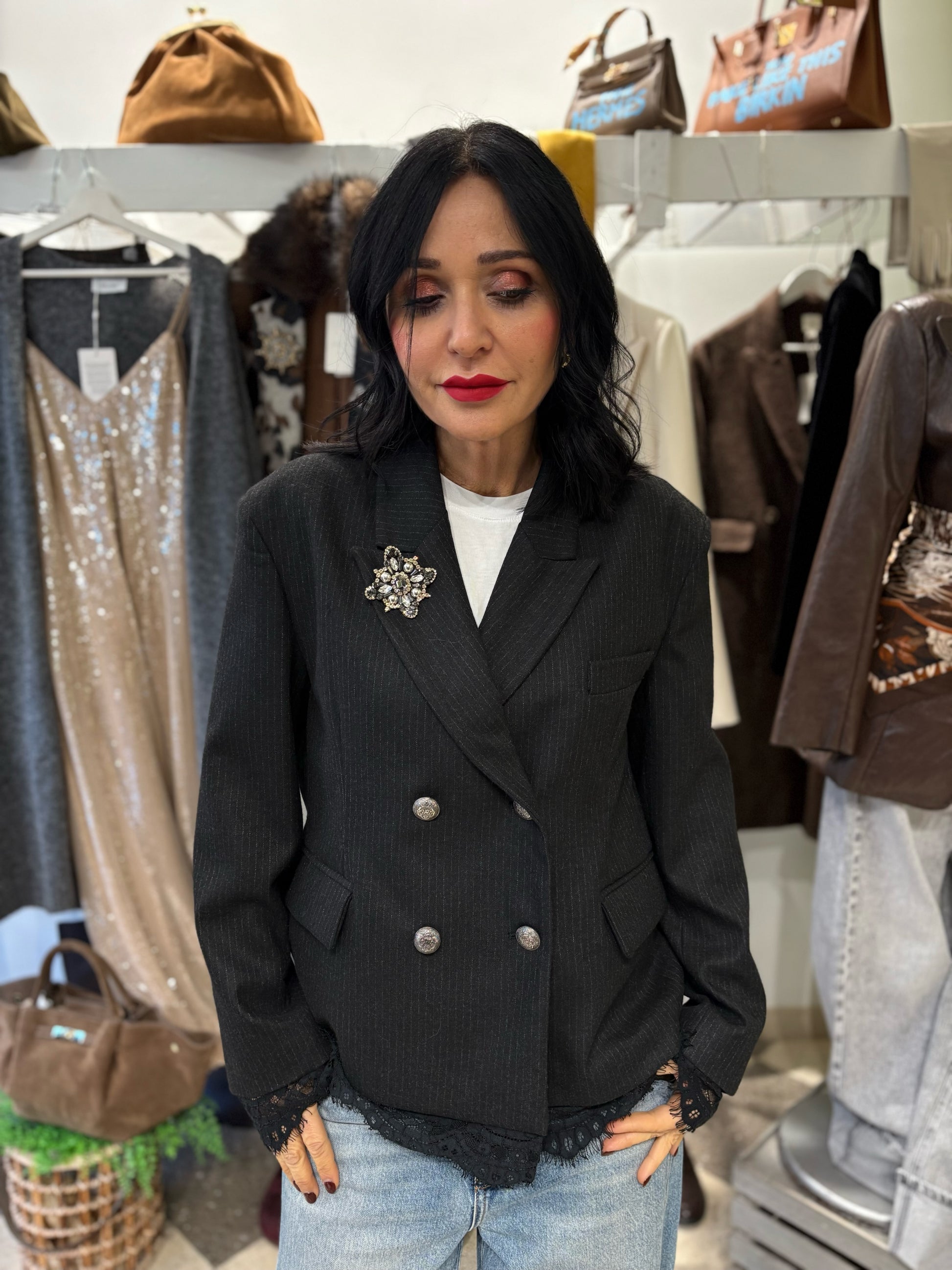 Giacca doppiopetto dal taglio sartoriale, elegante e femminile, resa unica dai dettagli in pizzo nero sul bordo inferiore e sui polsini.