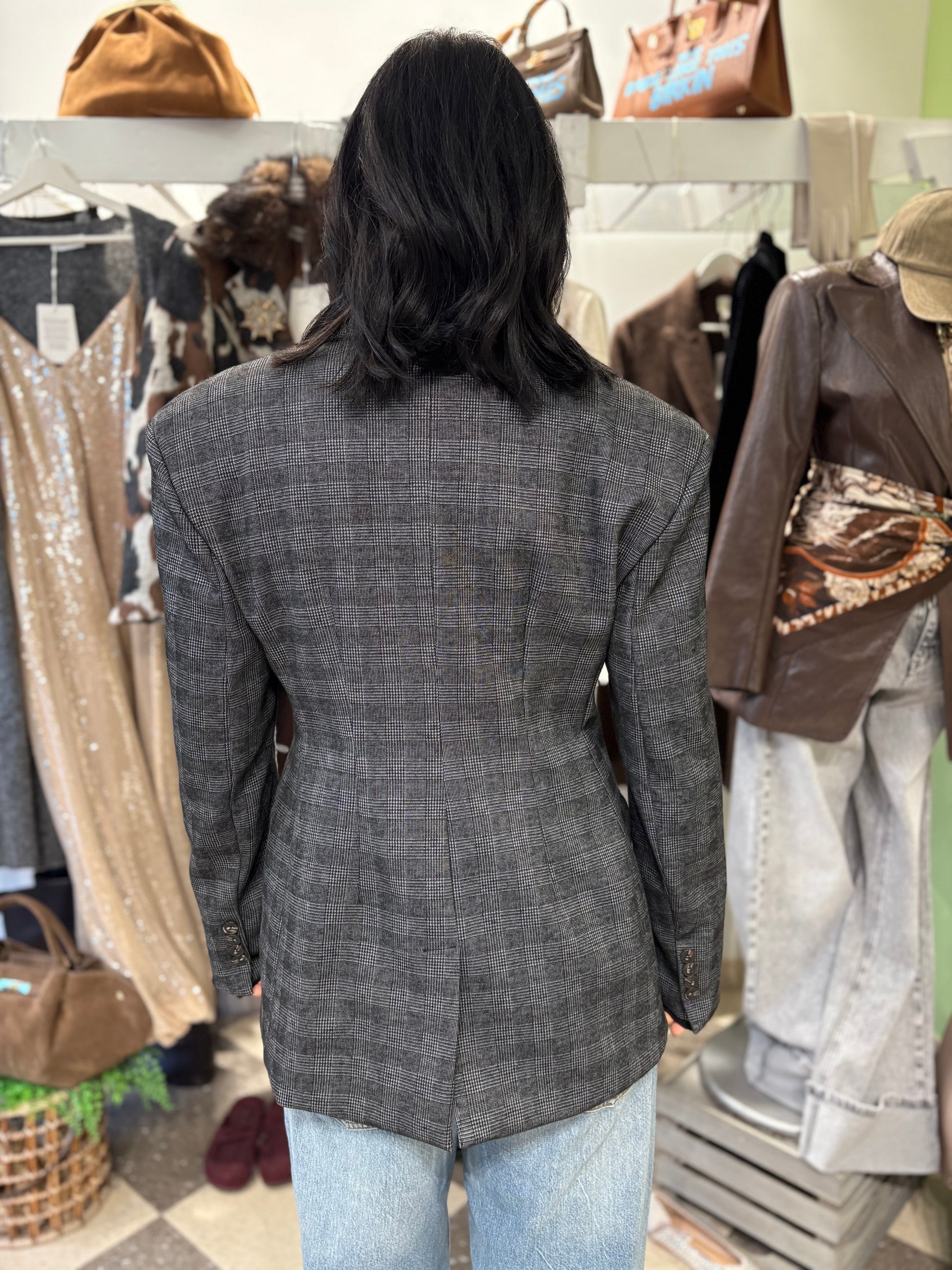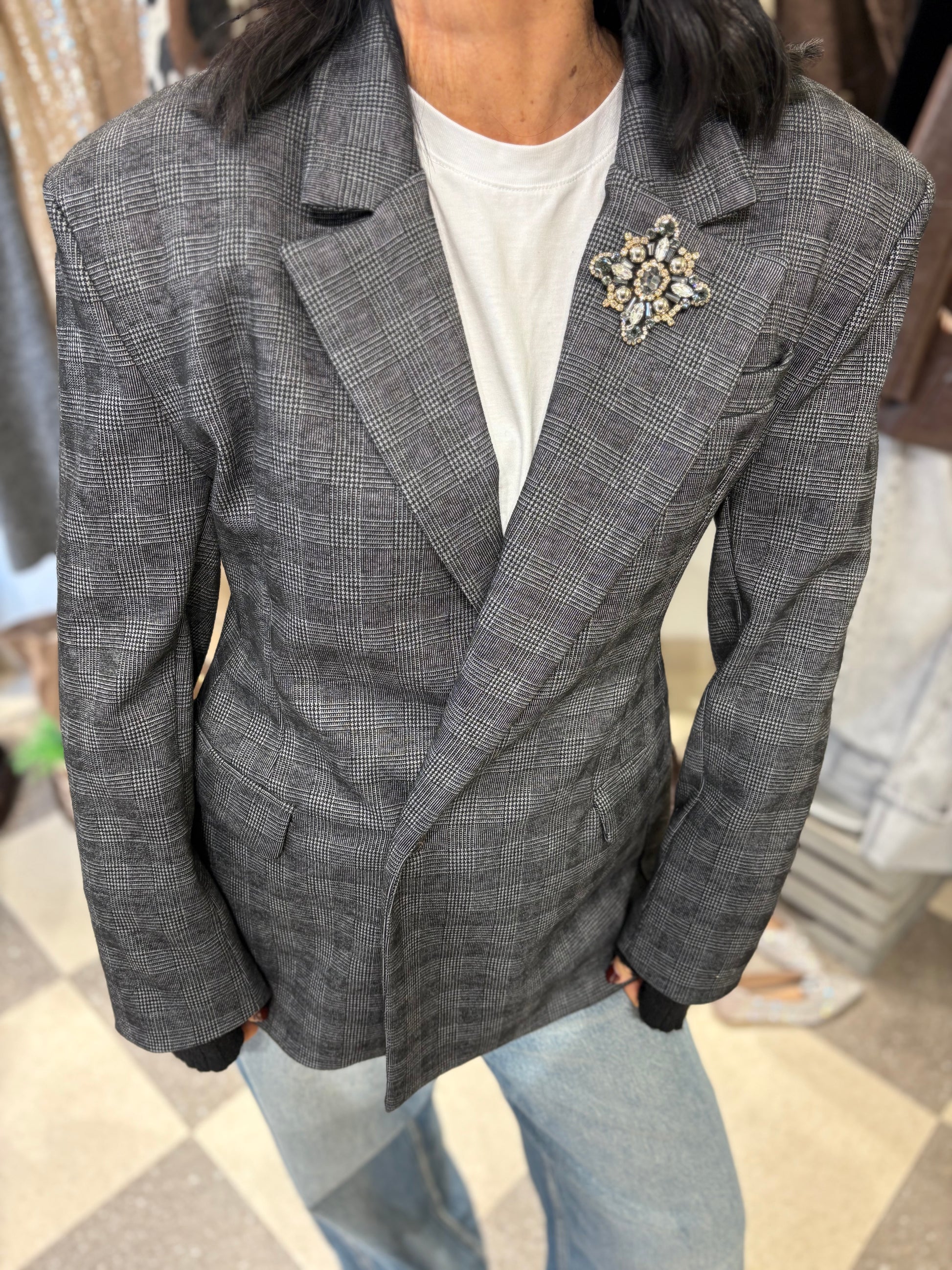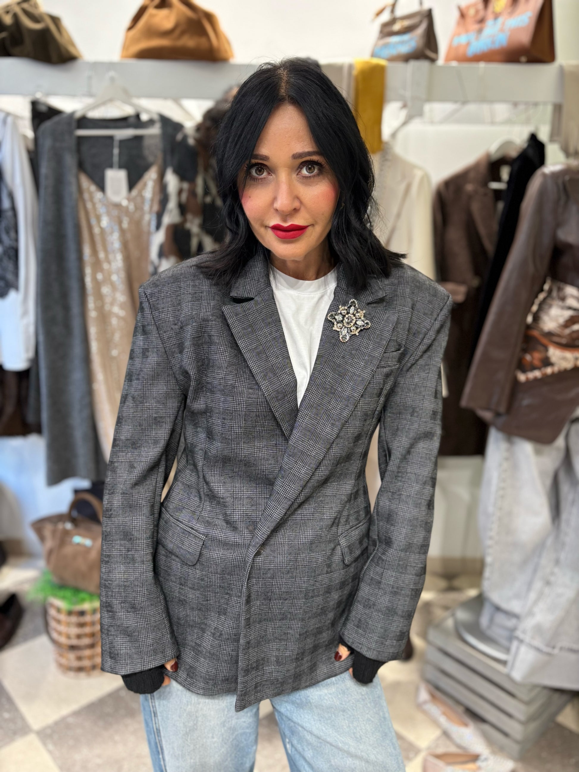 Giacca sartoriale a quadri dal taglio strutturato e femminile. La linea pulita valorizza la silhouette mantenendo un’eleganza senza tempo, mentre la fantasia check nei toni del grigio la rende estremamente versatile. Perfetta da indossare sia con denim che con pantaloni più sartoriali, per un look deciso ma raffinato. La spilla è compresa.