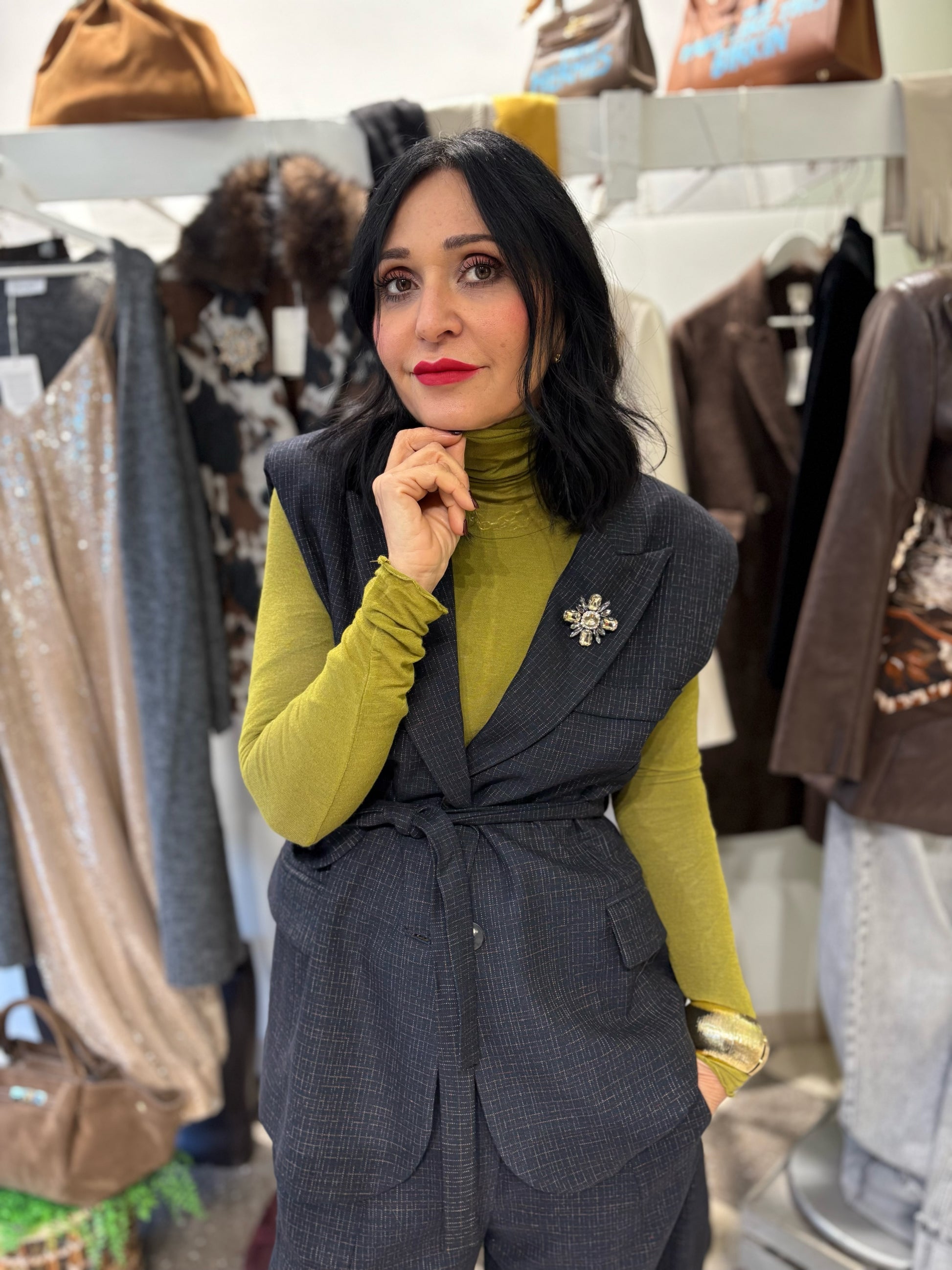 Gilet in misto viscosa con cintura in vita. Spilla inclusa.