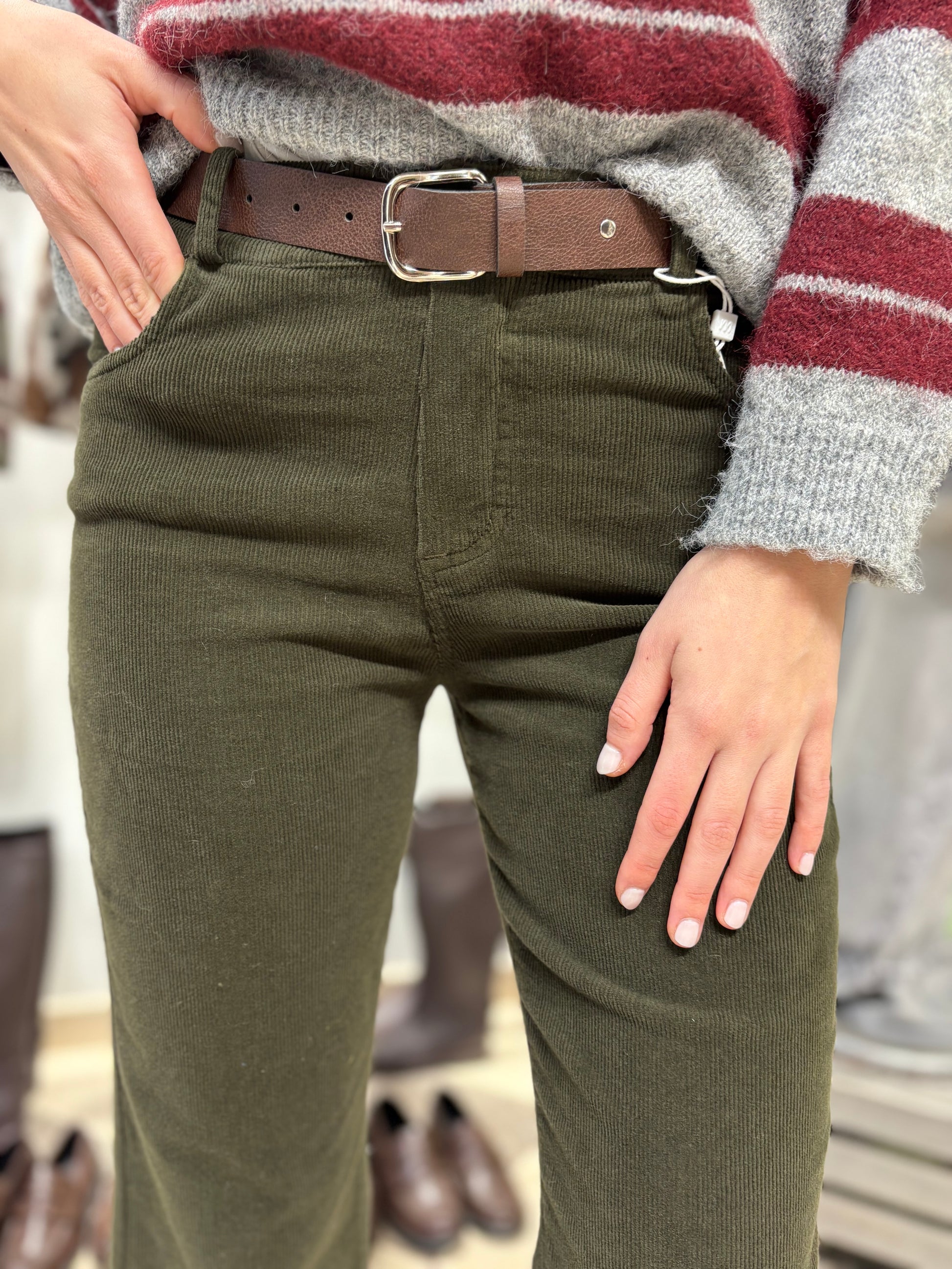 Vita media, pantalone a trombetta in velluto a coste sottili e orlo a vivo.
