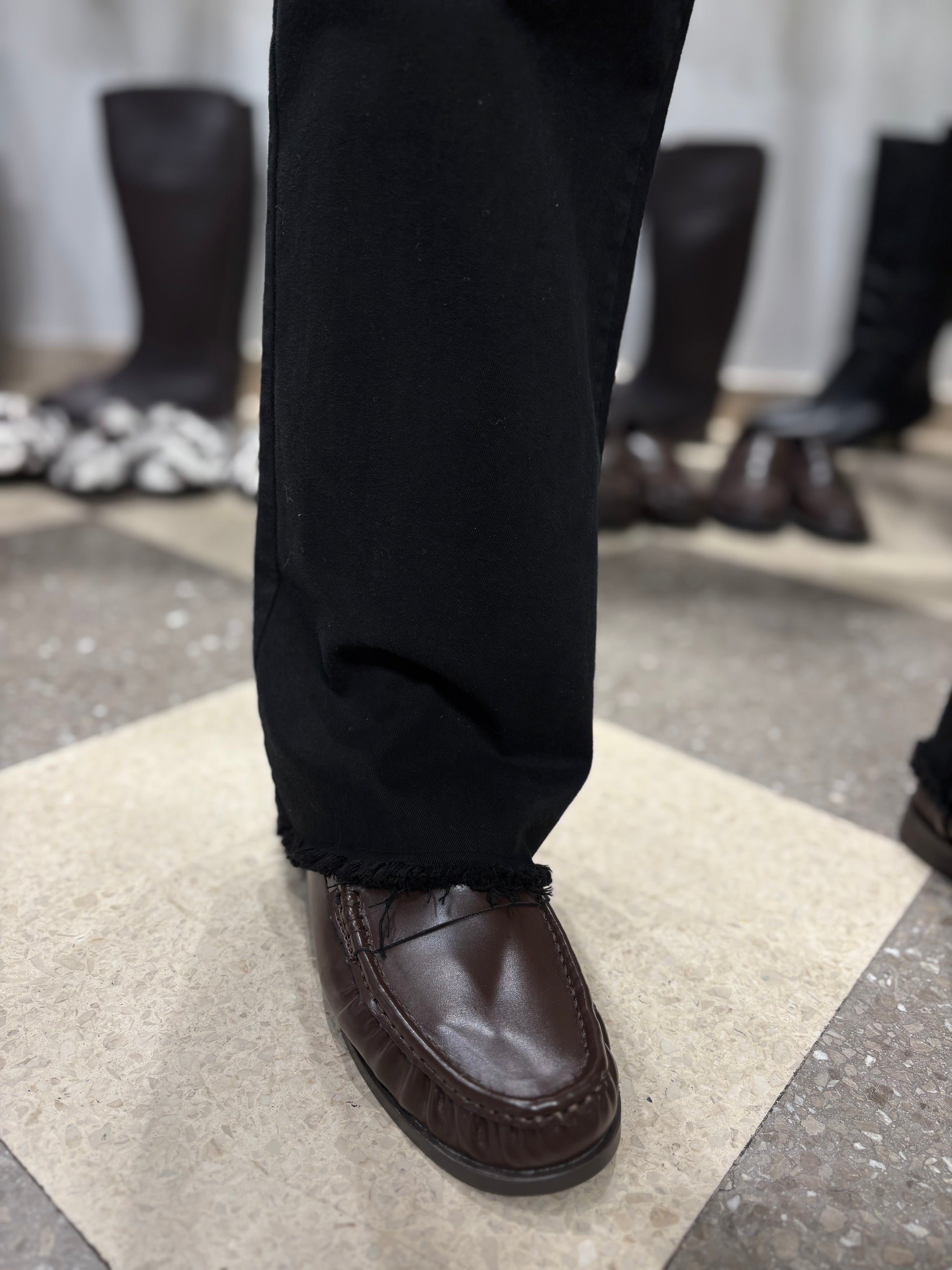 Pantalone mano pesca, full length, vita media e orlo a vivo. Dotato di cintura.