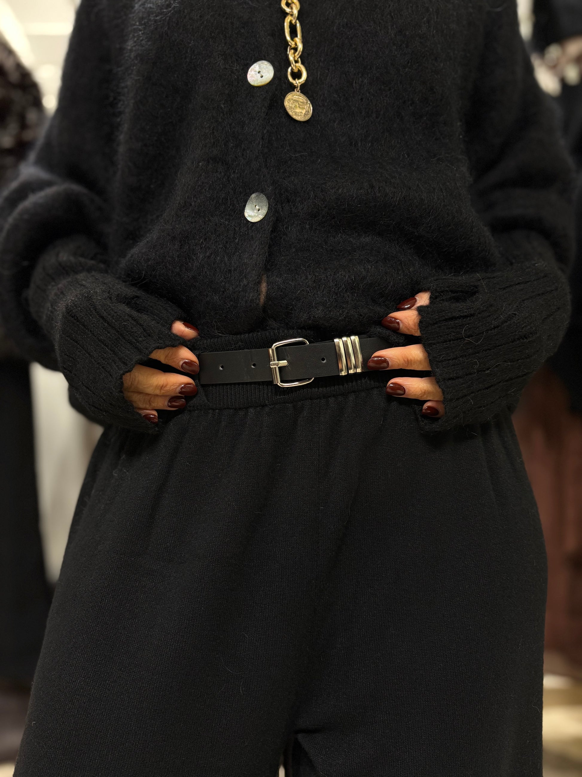 Pantalone elasticizzato in misto viscosa, venduto con cintura compresa. Non ha tasche.