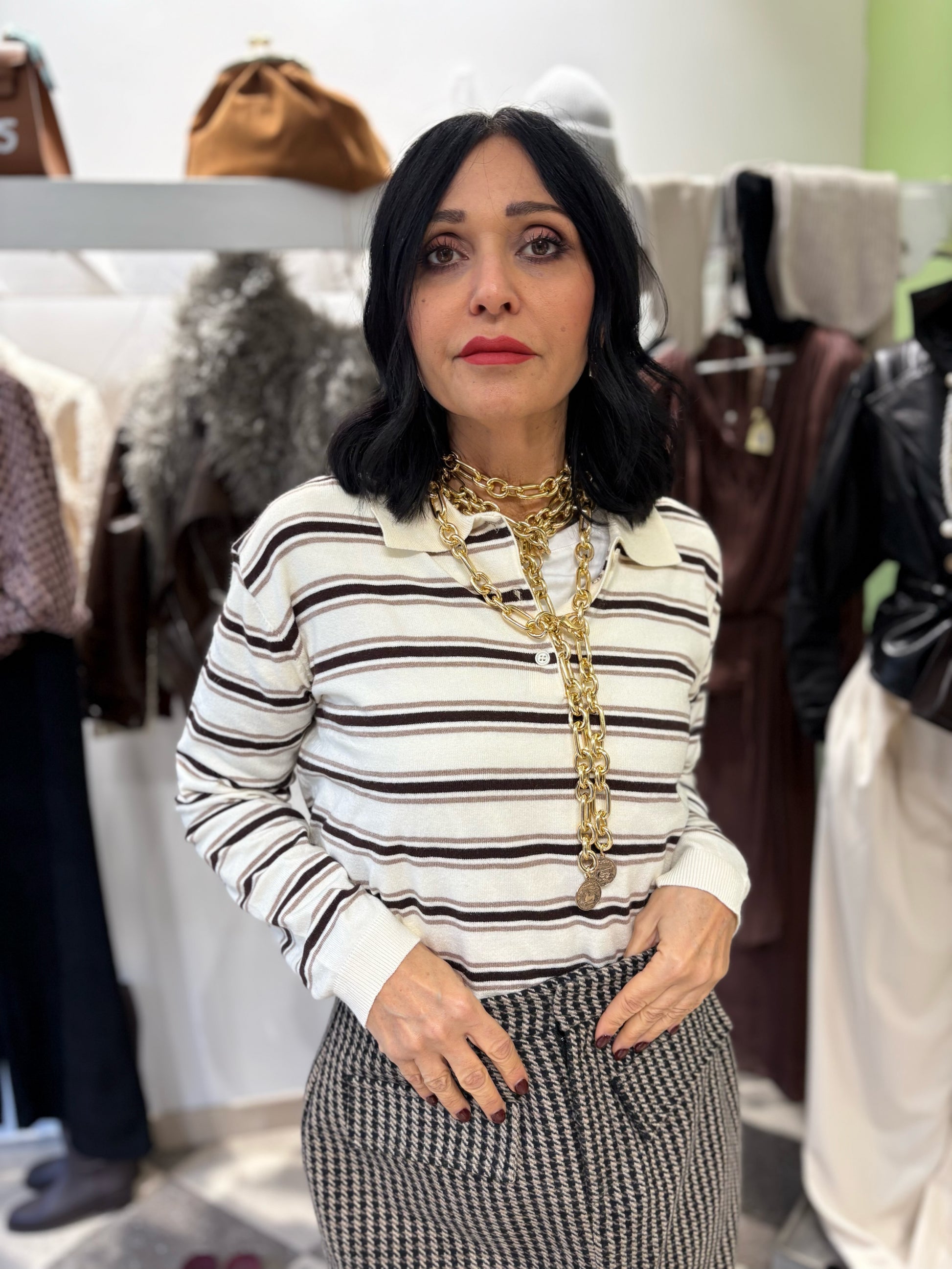 Polo a manica lunga, base panna e righe cioccolato e tortora.